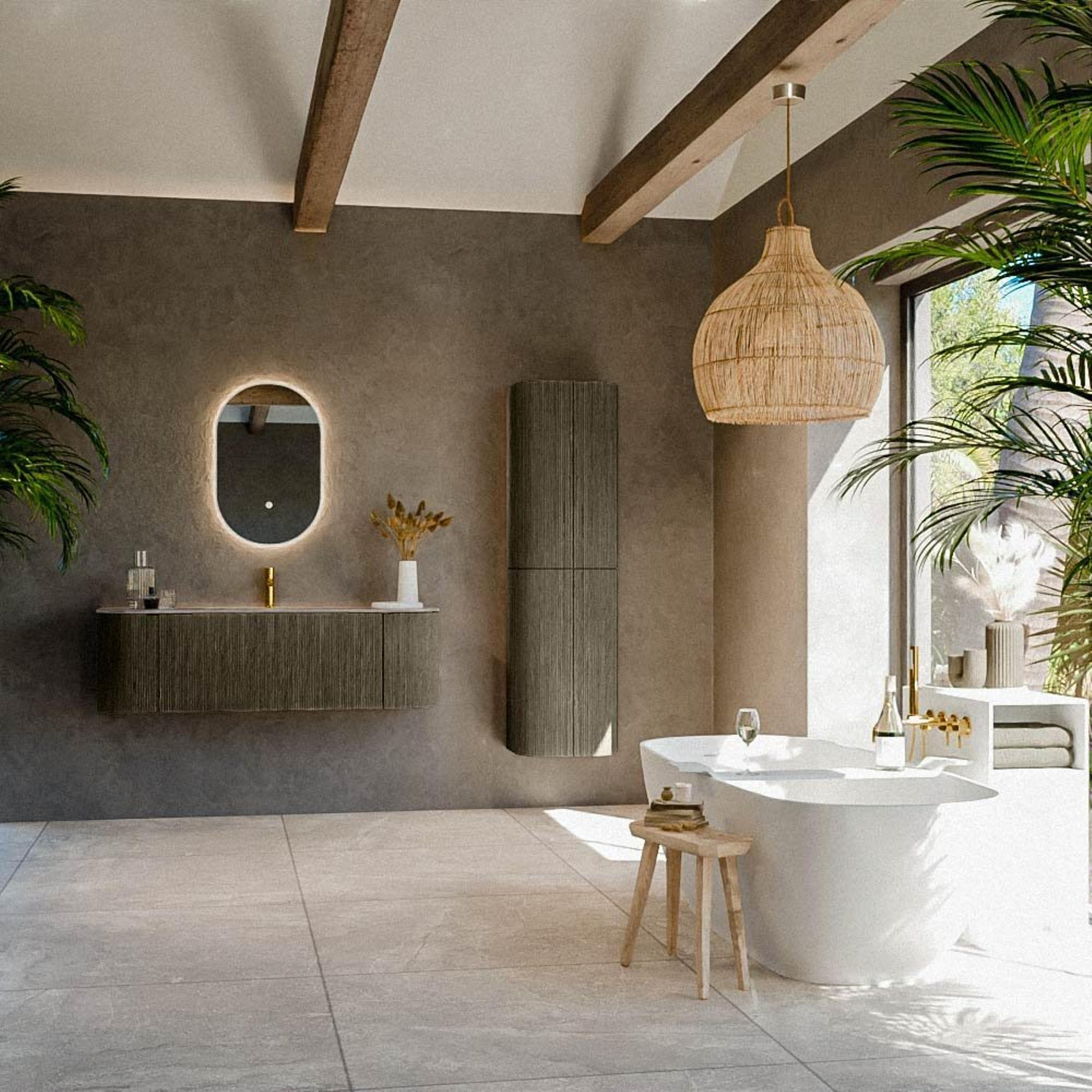 Ce meuble se distingue immédiatement par ses élégantes courbes à gauche ET à droite, ce qui rend l’ensemble plus doux qu’un meuble de salle de bains rectangulaire standard. Les façades avec structure à nervures verticales apportent plus de profondeur et de luxe, tandis que la couleur Shadow offre une apparence moderne et intemporelle qui se marie sans effort avec des carreaux aspect béton, de la pierre naturelle ou de la céramique blanche épurée. Comme le meuble est suspendu au mur, le sol reste libre, ce qui rend votre salle de bains visuellement plus spacieuse et plus lumineuse tout en facilitant le nettoyage. Le lavabo intégré de couleur Oza crée un beau contraste avec le meuble foncé, faisant de l’ensemble un véritable point de mire dans votre salle de bains.