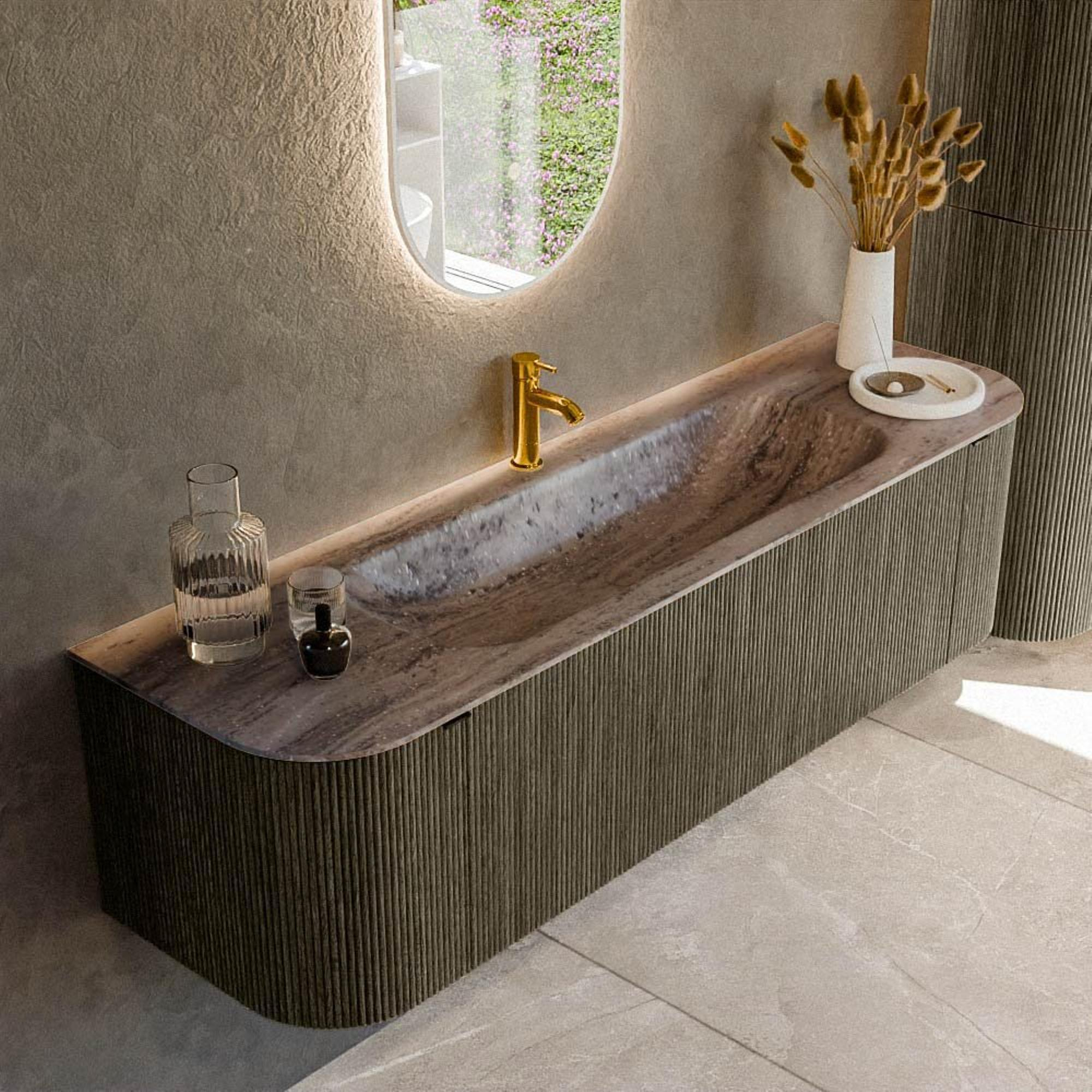 MONDIAZ KURVE-DLUX 160cm badmeubel ronding Links + Rechts kleur Shadow met 1 lade en 2 deuren. Wastafel BIG MEDIUM Midden 1 kraangat Oza.