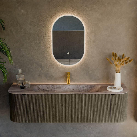 Les angles arrondis et les courbes aussi bien sur le côté gauche que droit créent un jeu de lignes particulièrement harmonieux. Non seulement l’effet est élégant, mais l’utilisation est également agréable : aucun angle vif le long duquel vous passez, mais un tracé doux qui apporte de la sérénité dans la pièce. La couleur Shadow s’accorde parfaitement avec les tendances modernes de salle de bains comprenant des nuances de gris, des sols en pierre naturelle ou des accents noirs. Grâce au design suspendu, le sol paraît plus spacieux et votre salle de bains reste aérée, même avec une largeur de 160 cm. Combinez ce meuble par exemple avec un grand miroir ou un miroir-armoire et vous créez en un instant un mur de lavabo luxueux.