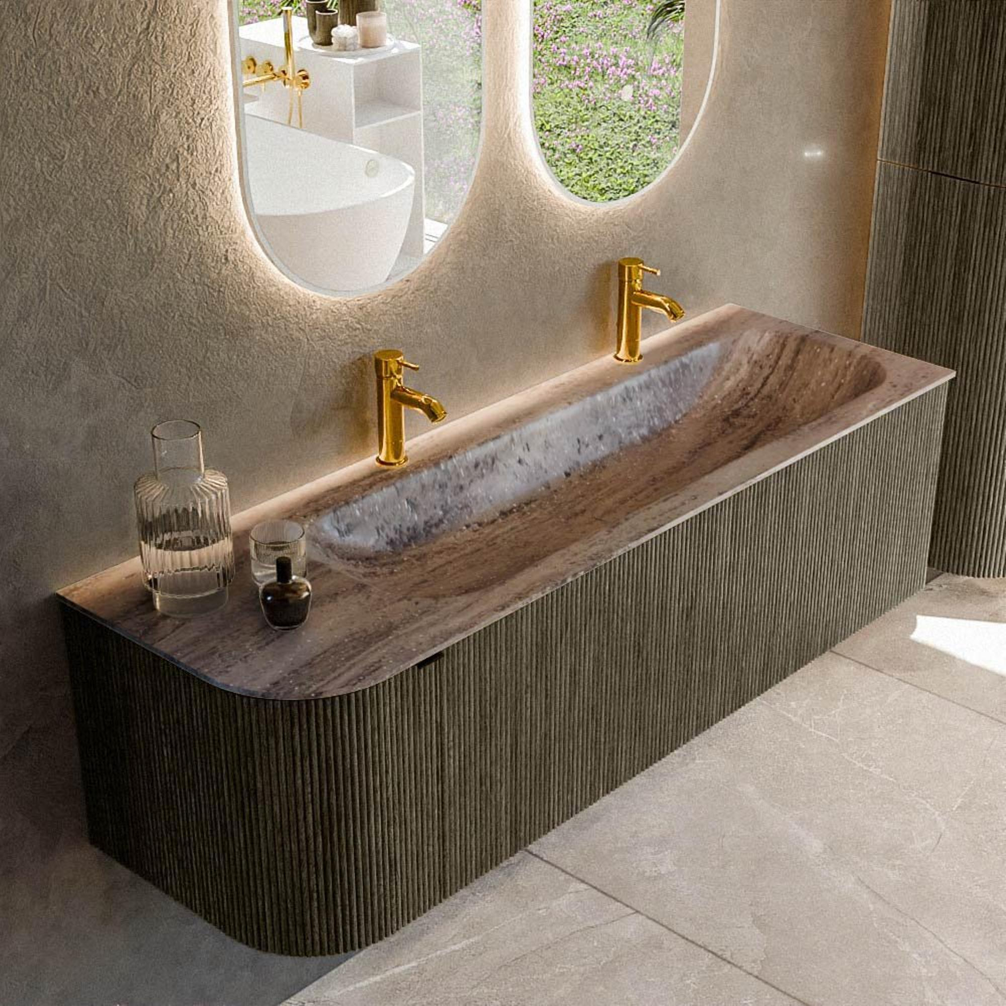 L’arrondi sur le côté gauche donne au meuble une forme ludique et organique, clairement différente des modèles rectangulaires standard. La couleur gris ombre (Shadow) a une apparence chic et contemporaine, et se marie à merveille aussi bien avec des carreaux aspect marbre clair qu’avec des looks béton ou bois plus bruts. La structure à nervures verticales sur les façades apporte une profondeur et un luxe supplémentaires, ce qui permet au meuble de faire une véritable déclaration de design même sans poignées apparentes. Comme le lavabo est positionné à droite, le côté gauche arrondi reste léger et aéré, idéal le long d’un passage ou dans une configuration d’angle. Vous introduisez ainsi des lignes douces dans votre salle de bains sans faire de compromis sur la fonctionnalité.