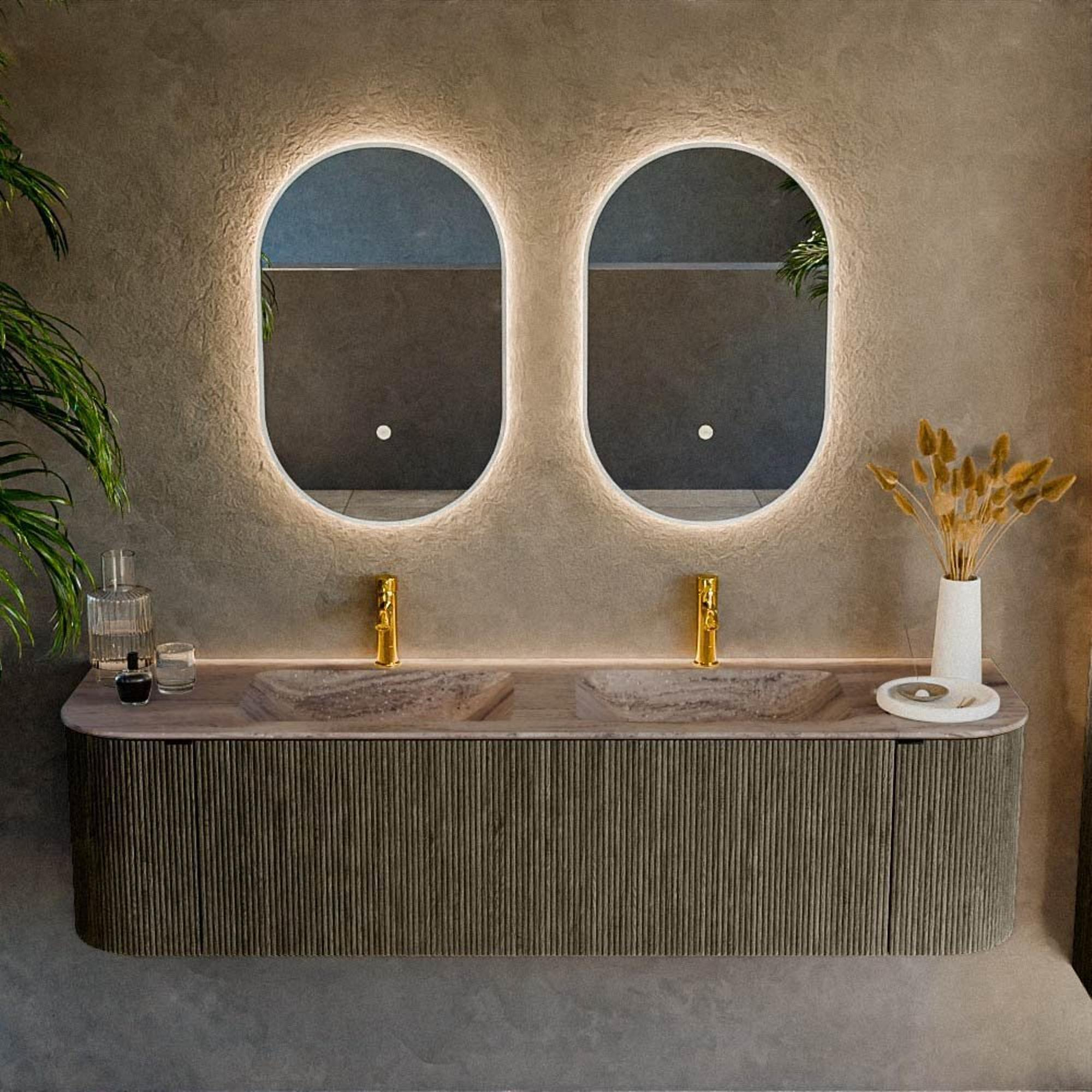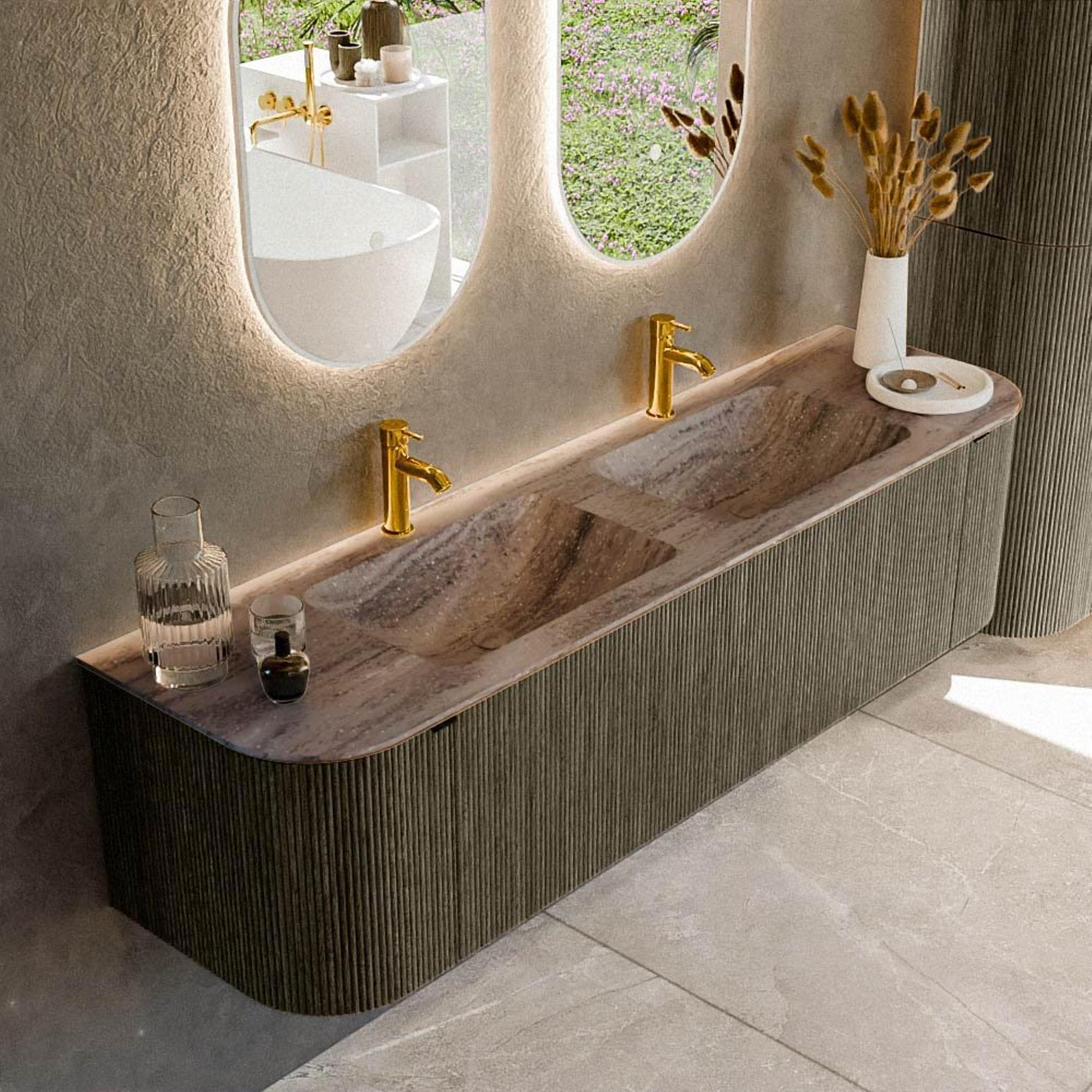 La forme arrondie à la fois sur le côté gauche et sur le côté droit donne à ce meuble une silhouette élégante, presque organique, qui attire immédiatement le regard dès que vous entrez dans la pièce. La structure à nervures verticales sur les façades crée de la profondeur et un jeu d’ombres, ce qui rend la couleur Shadow encore plus riche et donne instantanément plus d’ambiance à votre salle de bains. Comme le caisson et les façades sont conçus dans une ligne continue, le meuble paraît élancé et luxueux malgré sa largeur généreuse de 170 cm. La double vasque avec deux trous de robinet s’y raccorde parfaitement : sobre, minimaliste et parfaitement symétrique, afin de créer un ensemble harmonieux qui convient aussi bien aux salles de bains modernes qu’aux salles de bains au style hôtel chic.