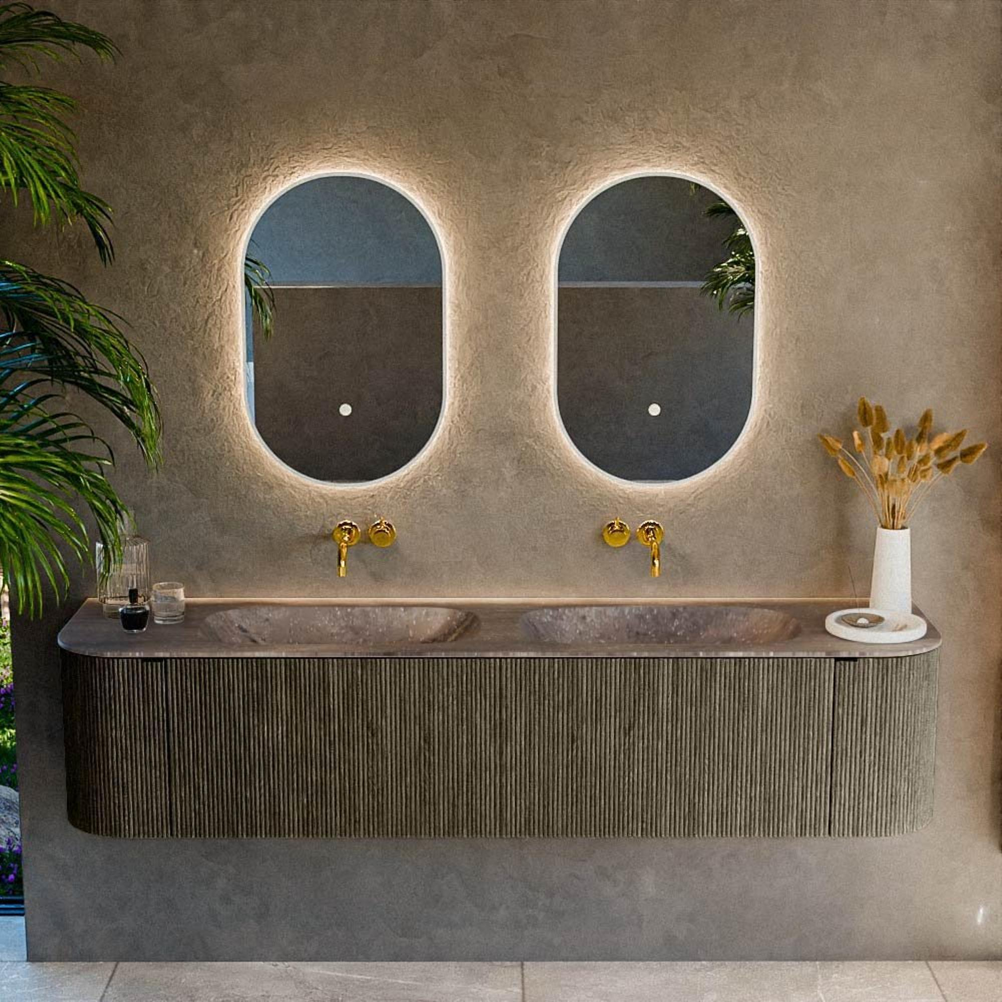 Les côtés arrondis aussi bien à gauche qu'à droite donnent au meuble une forme élégante et fluide qui attire immédiatement le regard, sans jamais être criarde. La structure verticale à nervures sur les façades crée de la profondeur et un jeu de lumière ludique, ce qui fait du meuble un véritable accroche-regard même sans décoration supplémentaire. La couleur Shadow – un ton de gris chic – s'accorde parfaitement avec des teintes de carrelage populaires comme le look béton, le look bois et la robinetterie blanche mate. Comme le meuble est monté de façon suspendue au mur, le sol reste dégagé : idéal si vous souhaitez conserver une sensation d'espace ou, par exemple, laisser le chauffage par le sol bien visible se poursuivre.