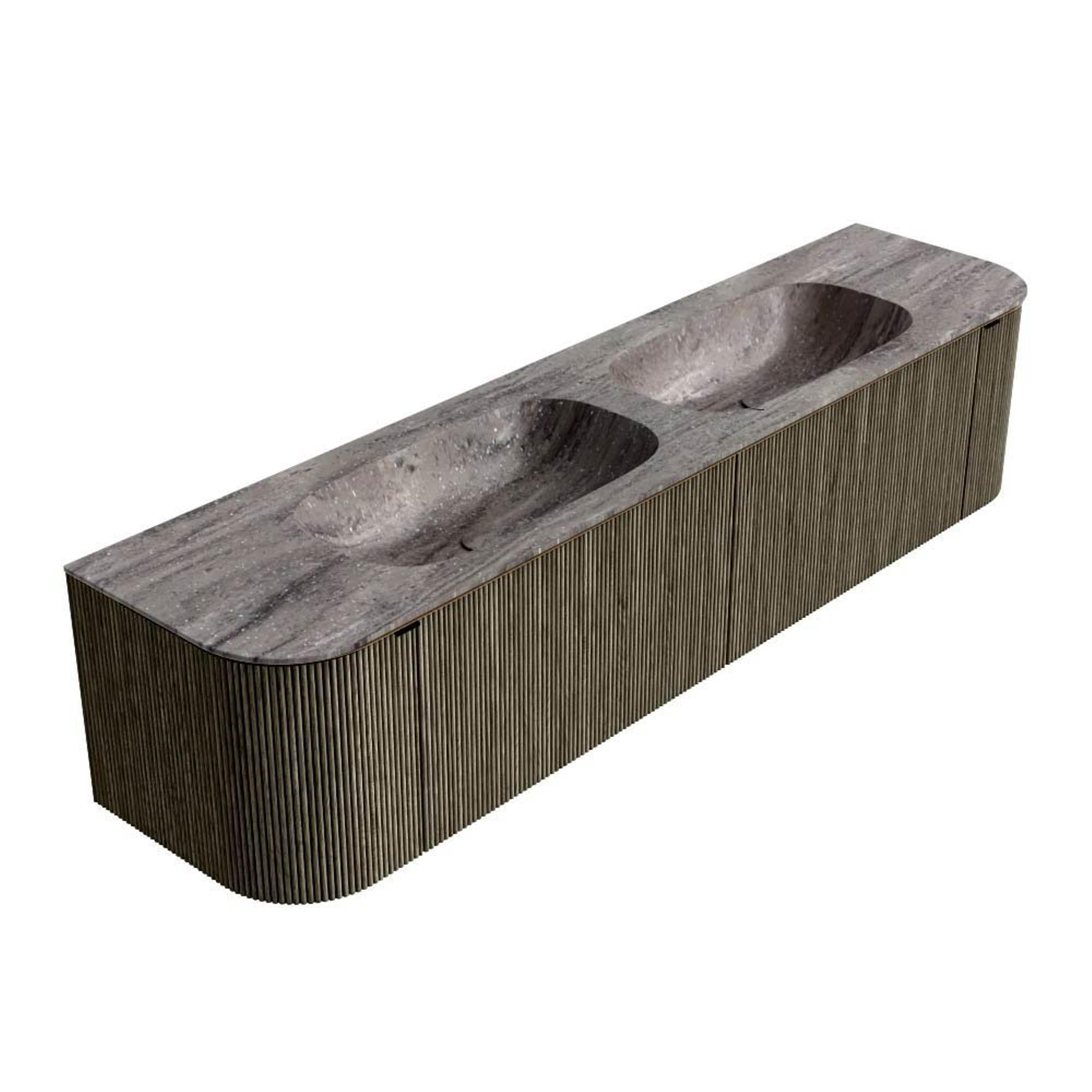 MONDIAZ KURVE-DLUX Meuble de salle de bains 190cm arrondi gauche + droite couleur Shadow avec 2 tiroirs et 2 portes. Plan-vasque STOR SMALL Double sans trou de robinet Oza.
