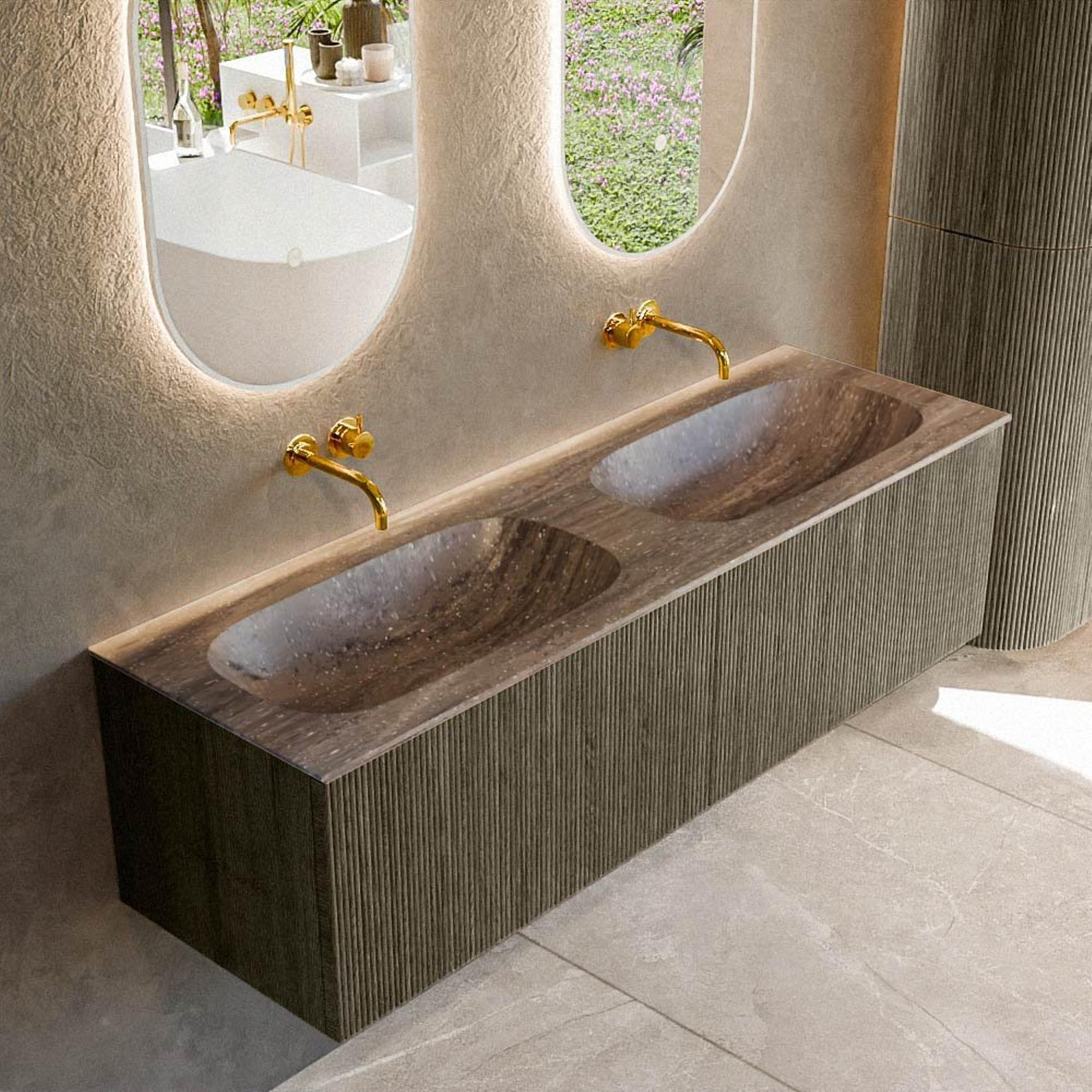 MONDIAZ KURVE-DLUX Meuble de salle de bains 150cm couleur Shadow avec 2 tiroirs et 0 portes. Plan-vasque STOR SMALL Double sans trou de robinet Oza.