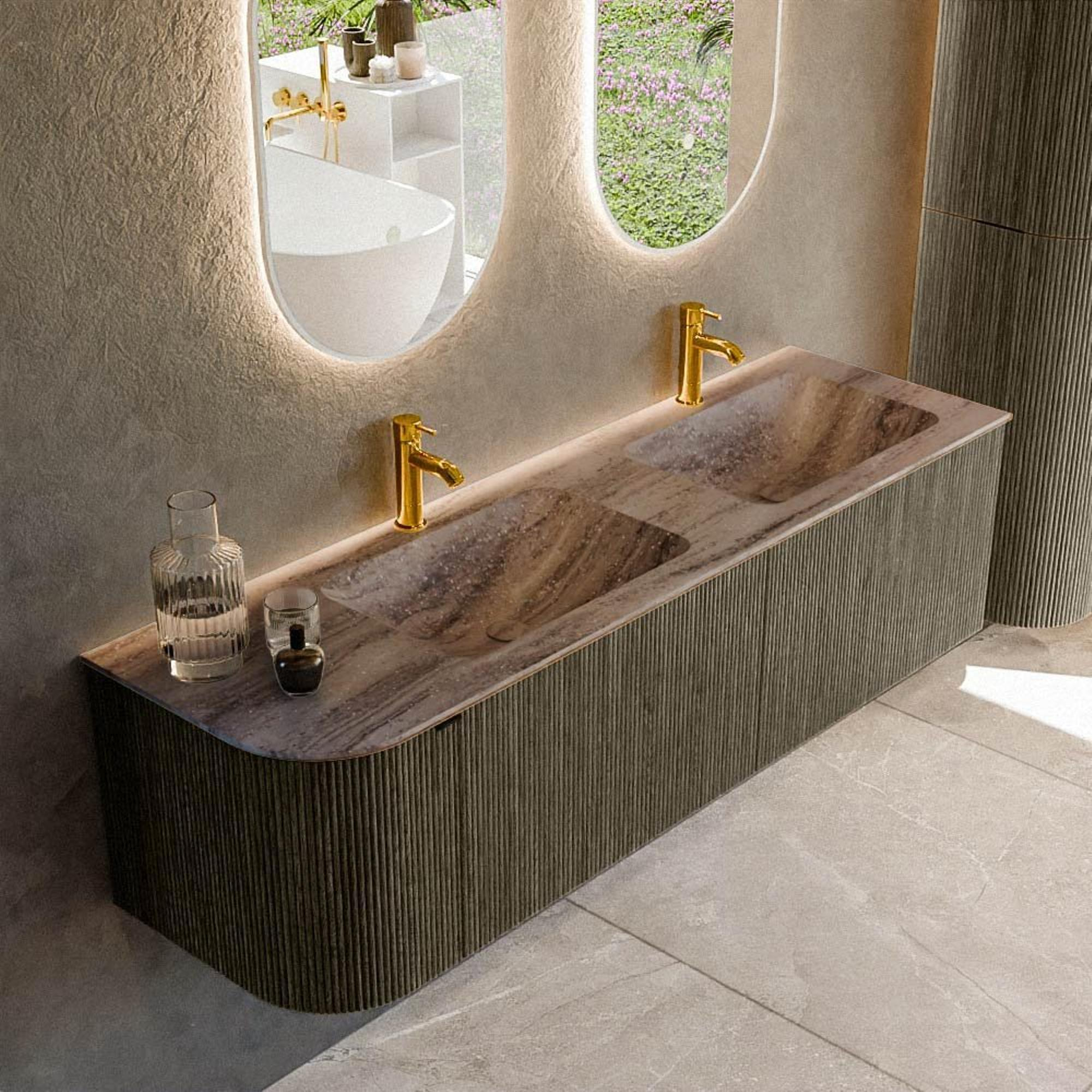 La subtile courbure sur le côté gauche confère au meuble une allure douce et organique qui attire immédiatement le regard, sans être tape-à-l’œil. Cela le rend particulièrement adapté aux salles de bains dans lesquelles vous souhaitez rompre les lignes droites avec un élément élégant et arrondi. La couleur Shadow est une teinte de gris moderne qui se marie à merveille avec des robinets noirs, chromés ou au contraire avec des accents de bois chaud. La structure verticale nervurée de la façade crée une profondeur et un luxe supplémentaires, surtout en combinaison avec un bel éclairage de salle de bains. Votre salle de bains adopte ainsi immédiatement une atmosphère d’hôtel haut de gamme. Comme l’ensemble reste visuellement apaisant, le meuble demeure intemporel et vous pouvez facilement changer de style avec d’autres accessoires ou carreaux.