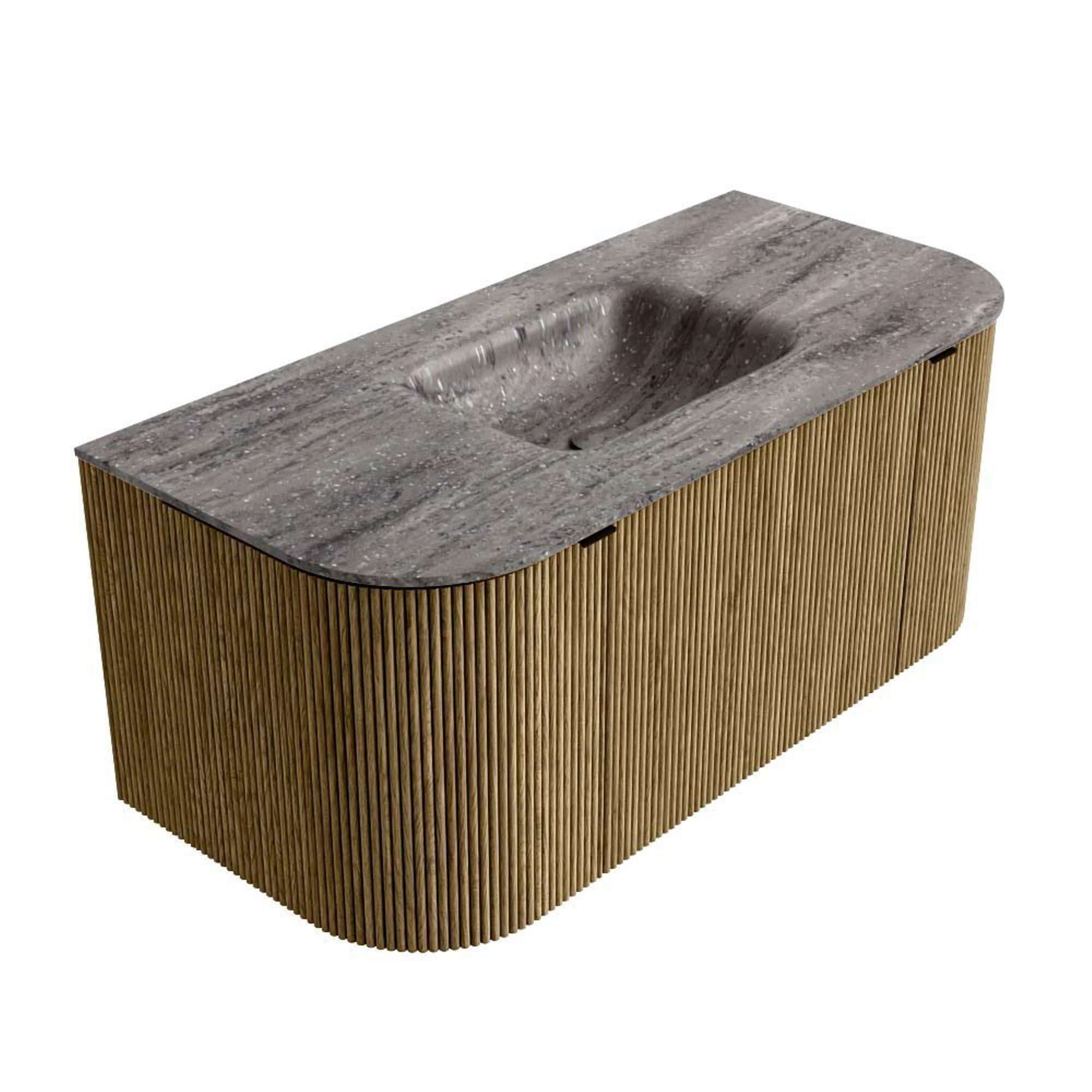 La forme rectangulaire avec angles arrondis à gauche et à droite donne immédiatement un aspect exclusif à votre salle de bains. La couleur Dusk possède une teinte naturelle, boisée, qui dégage chaleur et sérénité et se combine facilement avec des carreaux clairs, des accents noirs ou au contraire du métal brossé. La façade nervurée verticale crée un effet ludique de lumière et d'ombre et fait de ce meuble un véritable accroche-regard, sans être criard. Comme la vasque est placée au centre, l'ensemble paraît joliment symétrique et apaisé, ce qui apporte de l'équilibre surtout dans les salles de bains plus petites ou visuellement chargées.