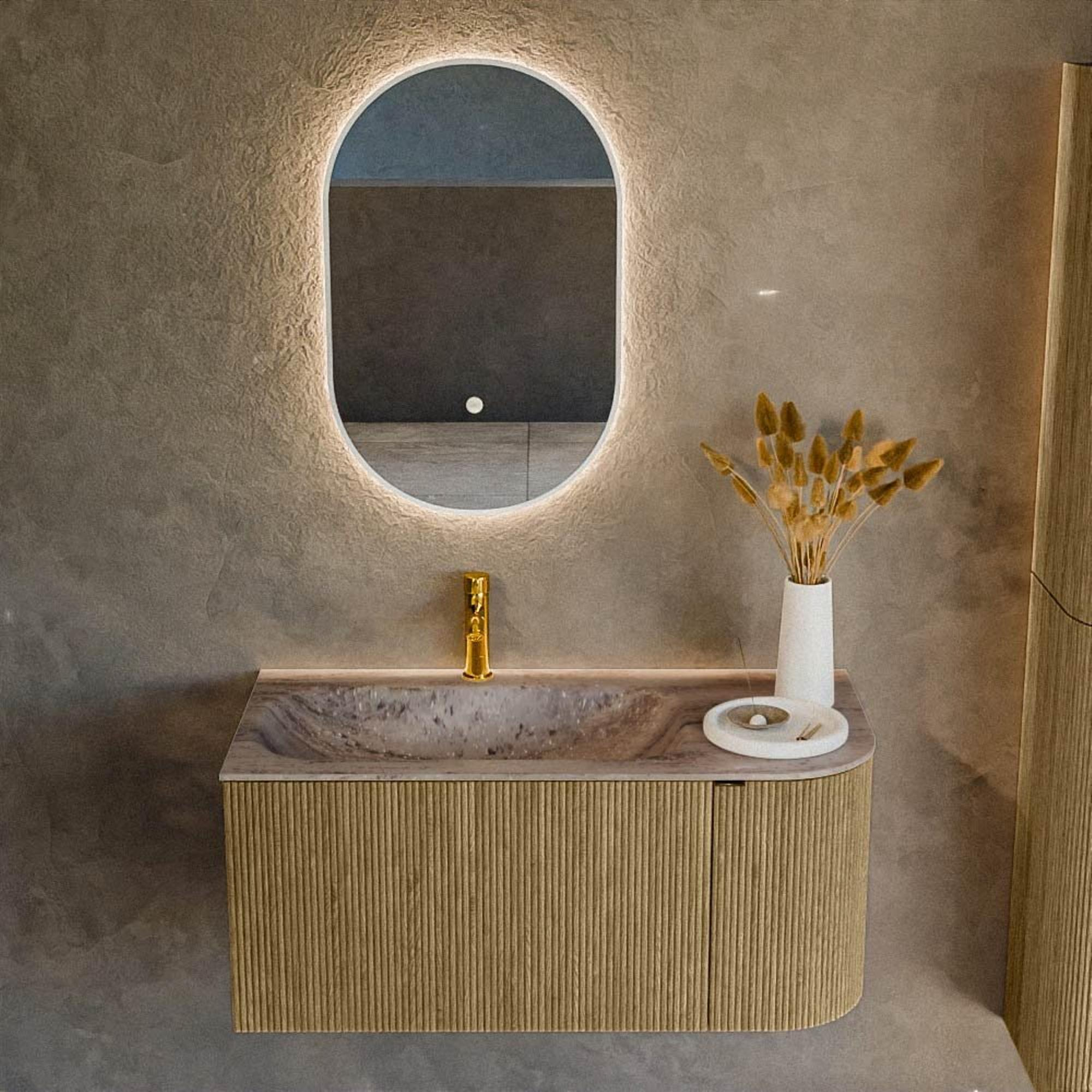 Le design se distingue immédiatement par la combinaison de lignes droites avec des angles arrondis et la forme arrondie sur le côté droit. Cela ne procure pas seulement plus d’espace de circulation, mais confère également une atmosphère luxueuse, presque digne d’un hôtel, à votre salle de bains. La couleur Dusk de la gamme de teintes bois offre un aspect chaleureux et naturel et apporte instantanément de l’ambiance à la pièce. La façade à rainures verticales crée un jeu d’ombre et de lumière ludique et donne au meuble une apparence moderne et haut de gamme. Précisément parce que le miroir n’est pas inclus avec ce modèle, vous avez toute la liberté de choisir vous-même un miroir de salle de bains ou une armoire de toilette assortis afin de compléter pleinement votre propre style.