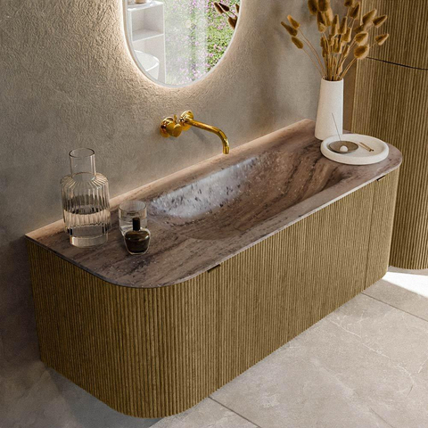 La courbe douce des deux côtés confère au meuble une allure design unique que l'on voit rarement sur les meubles de salle de bains standards. En combinaison avec la couleur Dusk et la façade à nervures verticales, votre salle de bains obtient immédiatement un aspect haut de gamme, presque comme un véritable meuble de séjour. La teinte bois s'accorde parfaitement avec des matériaux naturels comme les carreaux effet bois, mais crée également un contraste chic avec un effet béton ou des murs blancs. Comme le meuble est sans poignées et fonctionne avec un système push-to-open, la façade reste totalement lisse et aucune poignée ne vient interrompre le jeu de lignes. Il en résulte une base calme et minimaliste que vous combinez facilement avec différents styles de robinets et d'accessoires.