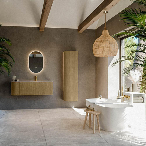 La couleur Dusk combinée à la façade verticale à rainures confère à ce meuble une allure luxueuse digne du design. La teinte bois paraît chaleureuse et naturelle, tout en restant suffisamment neutre pour se combiner facilement avec une grande variété de styles de salle de bains. Grâce à la façade 3D à rainures, il se crée de la profondeur et un jeu d’ombres dans le meuble, ce qui donne immédiatement plus de caractère à votre salle de bains. En combinaison avec un miroir ou un miroir-armoire épuré et un beau mitigeur de lavabo, par exemple en noir, chrome ou métal brossé, vous créez facilement un look haut de gamme comme dans les hôtels de luxe et les magazines de design. L’angle arrondi à gauche adoucit la ligne du meuble et est particulièrement esthétique le long d’un passage ou à côté d’une paroi de douche, car il paraît moins dur et offre une sensation plus agréable.