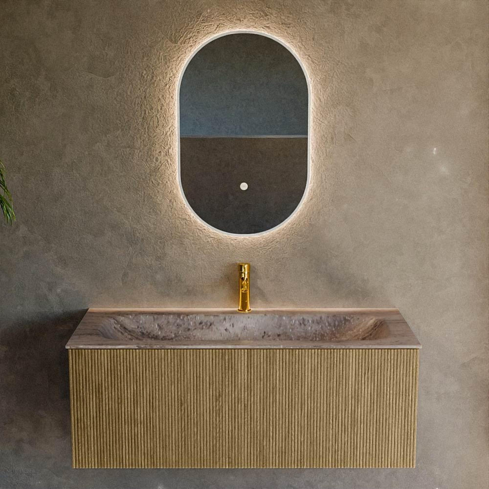 La combinaison de lignes droites, de la façade nervurée et de la chaleureuse couleur bois Dusk donne immédiatement à votre salle de bains une allure d’hôtel de luxe. Le relief vertical sur les façades crée un jeu de lumière ludique et rend le meuble juste un peu plus spécial qu’une façade lisse. Grâce à la structure bois subtile, ce meuble de salle de bains se combine facilement avec des carreaux effet béton, des imprimés marbre ou, au contraire, des murs unis et sobres. La composition symétrique avec le lavabo au milieu offre un aspect calme et équilibré, ce qui fait une grande différence en termes de perception de l’espace, surtout dans les petites pièces.