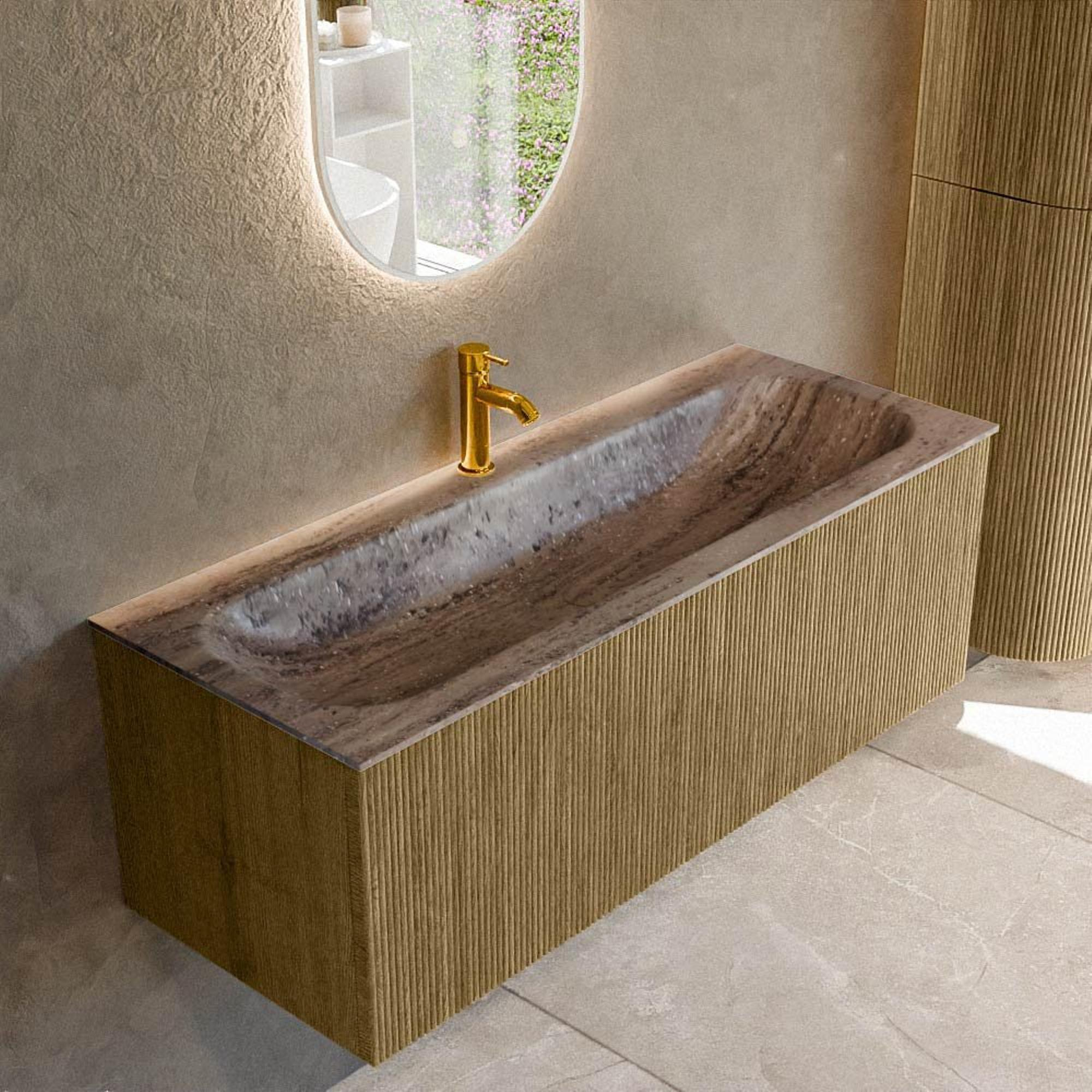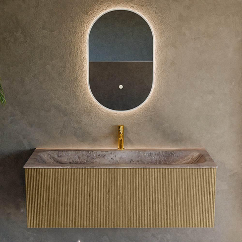 La couleur Dusk combinée à la façade verticale à nervures 3D confère à ce meuble un look luxueux, presque digne d'un hôtel. Le décor bois apporte chaleur et atmosphère, tandis que les lignes épurées sans poignées gardent l'ensemble moderne et minimaliste. Cette combinaison rend le meuble très polyvalent : vous pouvez le combiner magnifiquement avec des robinets noirs mats, mais aussi avec du chrome ou du métal brossé. Grâce à la structure nervurée, la façade gagne en profondeur et en caractère, de sorte que votre salle de bains gagne immédiatement en allure sans que vous ayez besoin d'ajouter beaucoup de décoration supplémentaire. La forme rectangulaire et les lignes arrondies de la ligne Kurve offrent en outre un aspect doux et chaleureux qui ne vous lassera pas de sitôt.