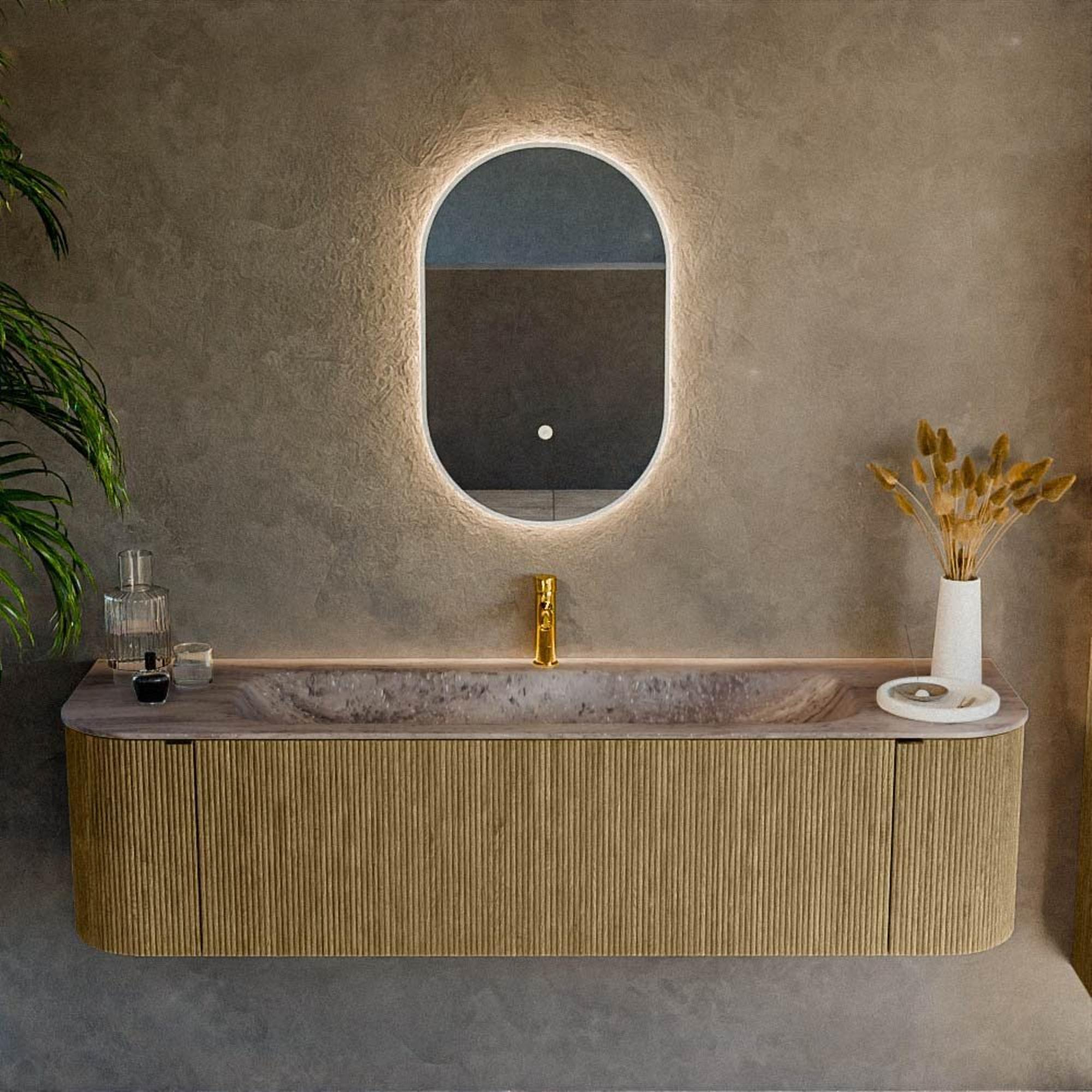 Les courbes subtiles à gauche et à droite confèrent au meuble une apparence douce et organique qui apporte immédiatement plus de luxe et de sérénité à votre salle de bains. Les façades nervurées avec texture verticale créent une profondeur supplémentaire et un jeu d’ombres raffiné, ce qui permet au meuble de se distinguer sans être criard. La couleur Dusk (une teinte boisée moderne) se marie à merveille avec la pierre naturelle, le béton ciré ou le carrelage blanc et constitue une base chaleureuse pour pratiquement tous les styles de salle de bains. En combinaison avec le lavabo Oza, vous créez un ensemble harmonieux dans lequel l’aspect bois et le solid surface épuré sont parfaitement équilibrés. Idéal si vous souhaitez faire une déclaration avec votre meuble de salle de bains tout en conservant une ambiance calme et intemporelle.