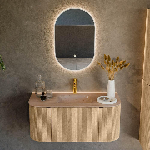 MONDIAZ KURVE-DLUX 100cm badmeubel ronding Links + Rechts kleur Oak met 1 lade en 2 deuren. Wastafel GRUNNE Midden 1 kraangat Saba.