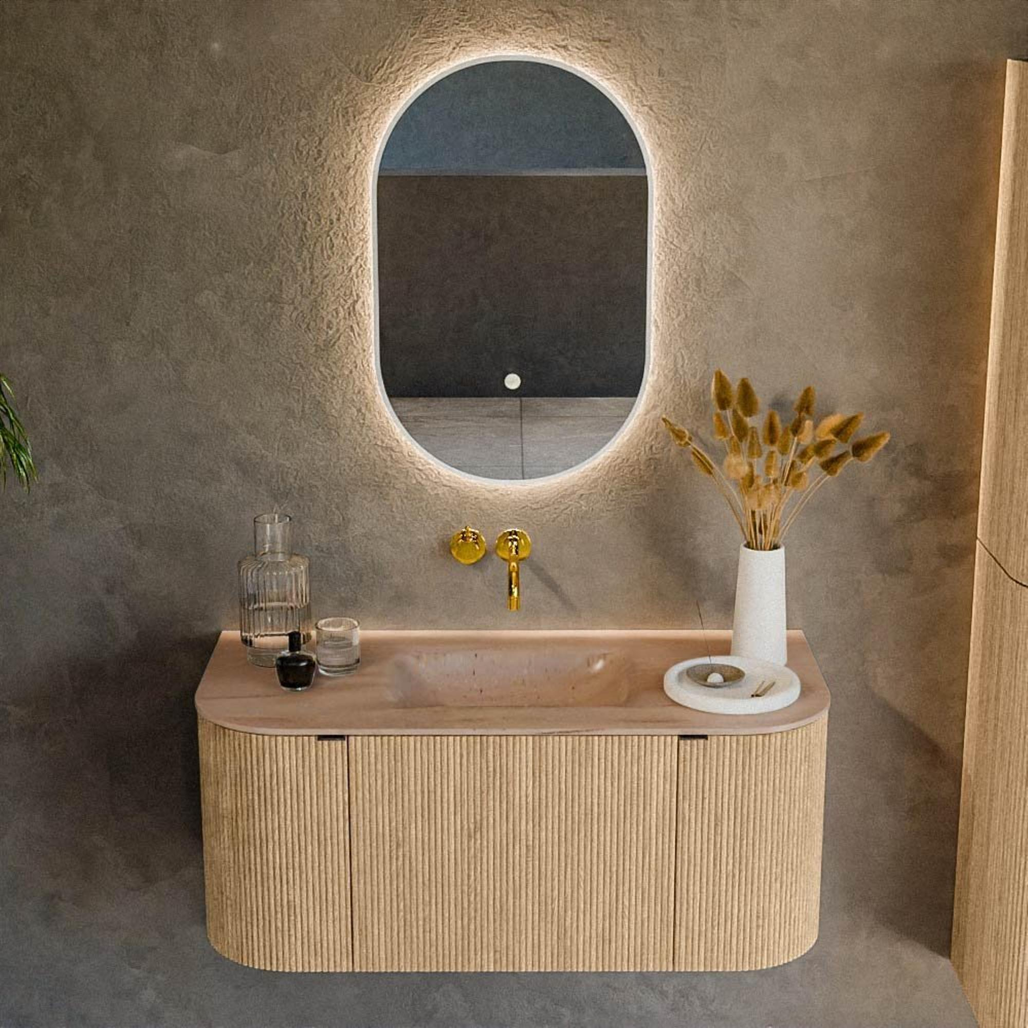 La forme rectangulaire avec angles arrondis à gauche et à droite donne immédiatement à votre salle de bains une apparence douce et design. La couleur Chêne y ajoute une touche naturelle et chaleureuse, ce qui rend la pièce accueillante et conviviale. La structure nervurée verticale sur la façade crée une profondeur et un luxe supplémentaires, sans être tapageuse. Cela permet de très bien combiner le meuble avec des carreaux sobres, mais aussi avec des motifs marqués ou des accents sombres. Comme le lavabo est positionné au centre, l’ensemble paraît joliment symétrique et épuré, ce qui apporte du calme dans le jeu de lignes de votre salle de bains.