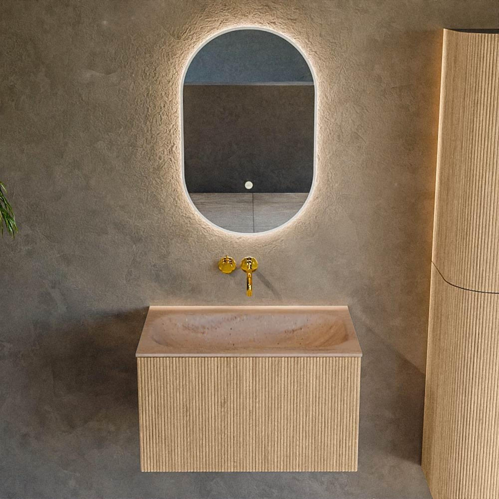 Les façades couleur oak avec structure nervurée verticale donnent immédiatement du caractère à votre salle de bains. Le relief crée un jeu de lumière ludique, tandis que la teinte bois apporte chaleur et convivialité dans une pièce souvent perçue comme froide. Les lignes épurées du meuble s’accordent parfaitement avec des carreaux modernes et des robinets noirs, chromés ou en laiton. Grâce à la finition sans poignées avec ouverture par poussée (push-to-open), la façade reste sobre et minimaliste, sans poignées saillantes qui interrompent le jeu de lignes. Il en résulte un meuble intemporel, facile à combiner avec d’autres meubles et accessoires de salle de bains, et qui paraîtra encore frais et actuel dans quelques années.