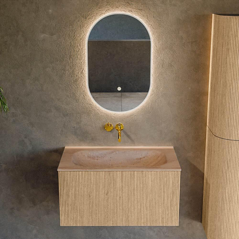 La couleur chêne du meuble crée une base chaleureuse et naturelle dans votre salle de bains, tandis que la structure nervurée verticale en façade offre immédiatement un aspect luxueux. Cette texture 3D capte la lumière de manière subtile, donnant à votre meuble profondeur et caractère sans paraître chargée. La forme rectangulaire épurée et les façades sans poignées avec système push-to-open s’intègrent parfaitement dans une salle de bains minimaliste ou design. Associez le meuble à des robinets et accessoires noirs, chromés ou en laiton brossé pour affirmer votre propre style. Ainsi, ce meuble ne constitue pas seulement un élément pratique, mais aussi la véritable pièce maîtresse de votre salle de bains.