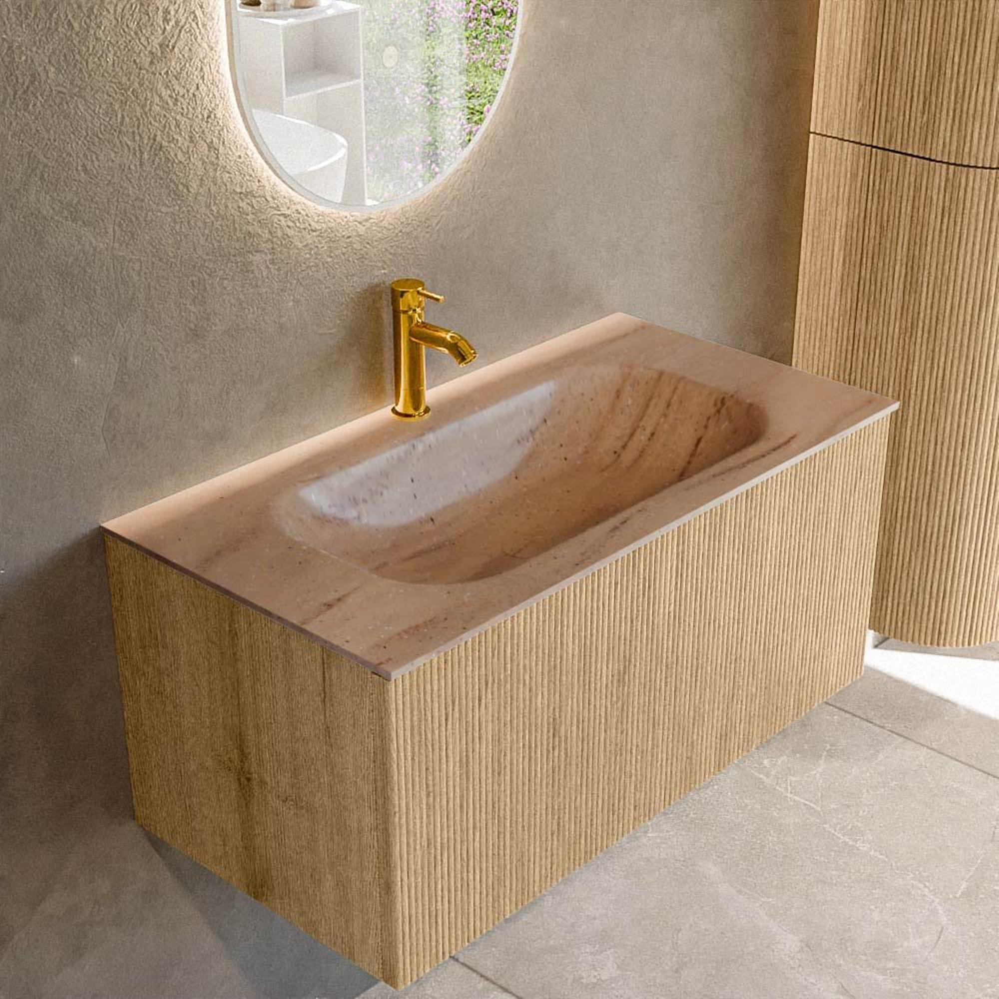 MONDIAZ KURVE-DLUX 90cm badmeubel kleur Oak met 1 lade en 0 deuren. Wastafel BIG SMALL Midden 1 kraangat Saba.