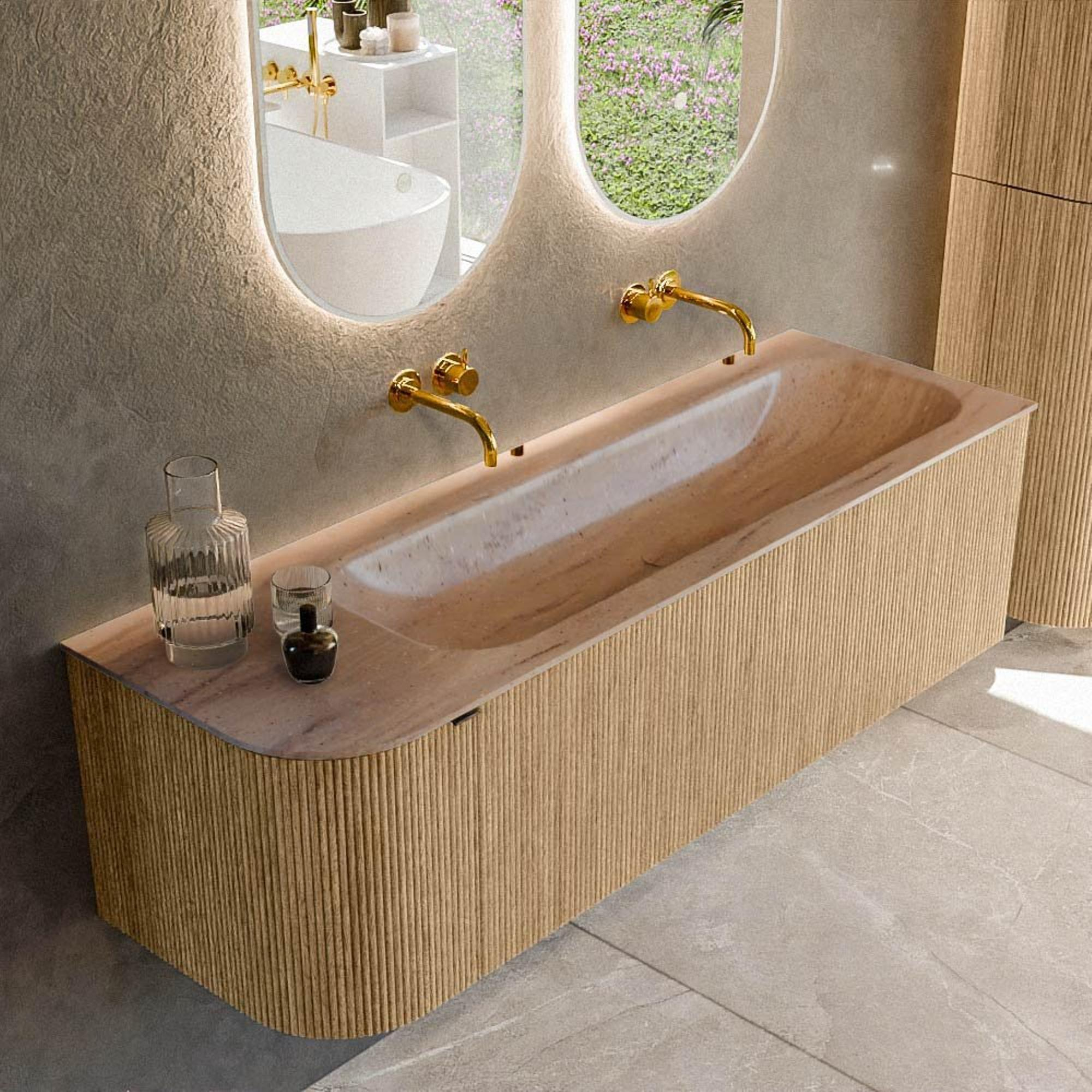L’arrondi caractéristique sur le côté gauche donne au meuble une apparence douce et organique et rompt les lignes droites de la salle de bains de manière élégante. La couleur chêne avec structure à nervures verticales en façade crée profondeur et texture, ce qui donne immédiatement à votre meuble lavabo une sensation de luxe et de sur-mesure. Comme le meuble est monté au mur, le sol reste dégagé et l’espace paraît plus grand et plus calme, ce qui est un grand avantage surtout dans les salles de bains plus petites ou en longueur. La combinaison de la teinte bois chaude avec le lavabo épuré de couleur Saba facilite l’association avec d’autres meubles de salle de bains, des robinets noirs ou chromés et divers styles de carrelage. Vous créez ainsi avec un seul meuble un ensemble harmonieux qui durera des années sans se démoder.