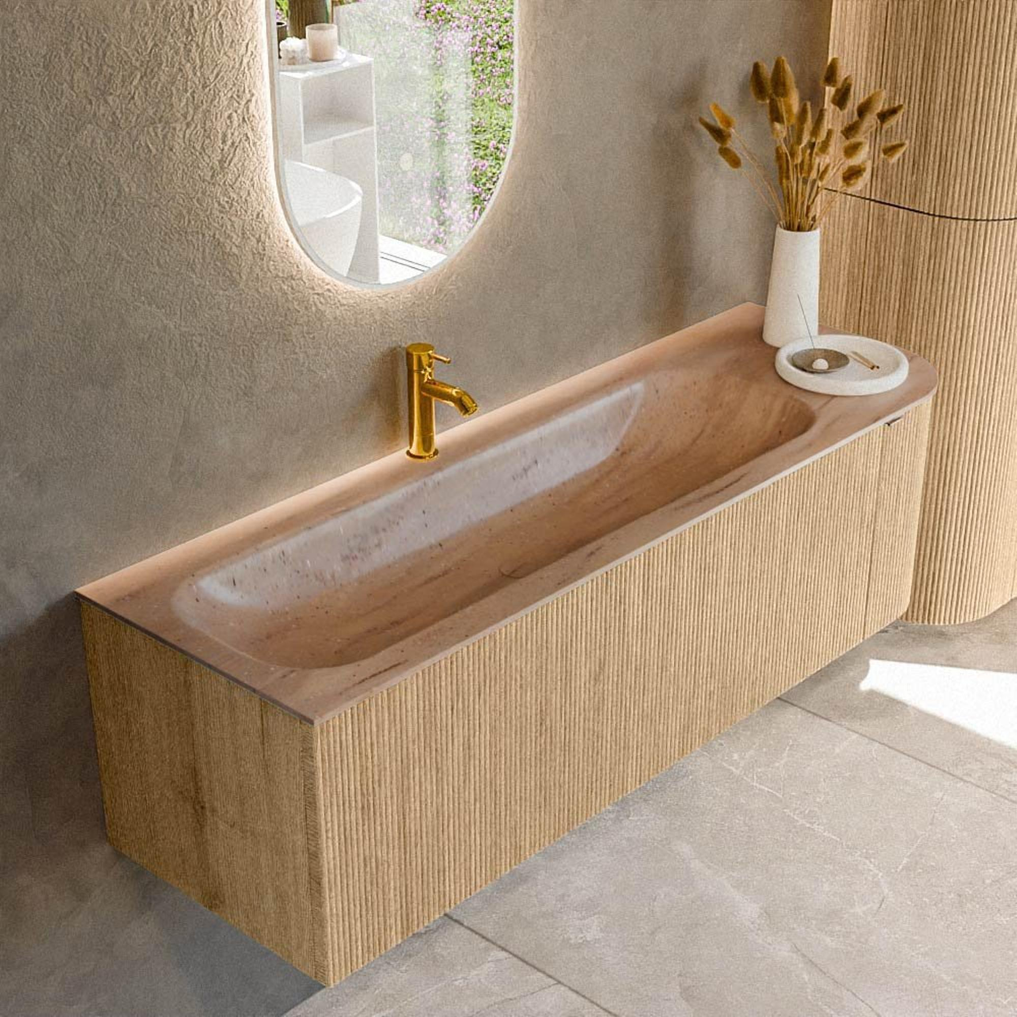La forme arrondie sur le côté droit donne à ce meuble un caractère unique et organique. Pas d’angles vifs lorsque vous entrez ou sortez, mais une ligne douce qui offre une sensation littéralement agréable et qui est en plus adaptée aux enfants. La couleur chêne avec structure nervurée verticale sur la façade ressemble à de véritables meubles de votre espace de vie : chaleureux, contemporain et atmosphérique. Par la combinaison avec la vasque blanche épurée, un beau contraste se crée, qui se marie parfaitement avec des robinets noirs mats, chromés ou en métal brossé. Ainsi, le meuble forme une base forte et intemporelle autour de laquelle vous construisez facilement votre propre style, du plus minimaliste au plus convivial et chaleureux.