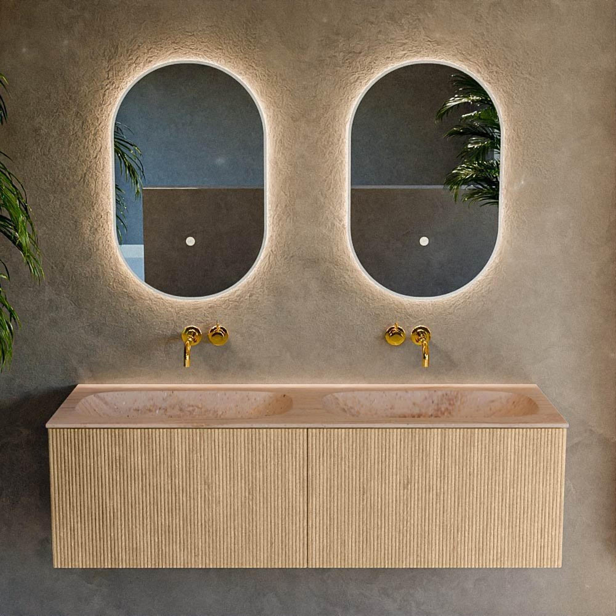 La couleur oak combinée à la façade à nervures verticales confère à ce meuble une apparence luxueuse, presque comme un meuble de séjour. L’ensemble paraît chaleureux et naturel, mais grâce à la forme épurée et aux lignes rectangulaires, il reste malgré tout moderne. Le lavabo beige Saba en solid surface y ajoute un aspect doux et haut de gamme. Ensemble, ils forment un bel élément accrocheur dans la salle de bains, qui se marie bien avec des carreaux clairs, un effet béton ou au contraire des accents sombres. Grâce à la façade sans poignées avec système push-to-open, le design reste sobre et minimaliste, ce qui n’est pas seulement esthétique, mais crée aussi du calme dans l’espace.