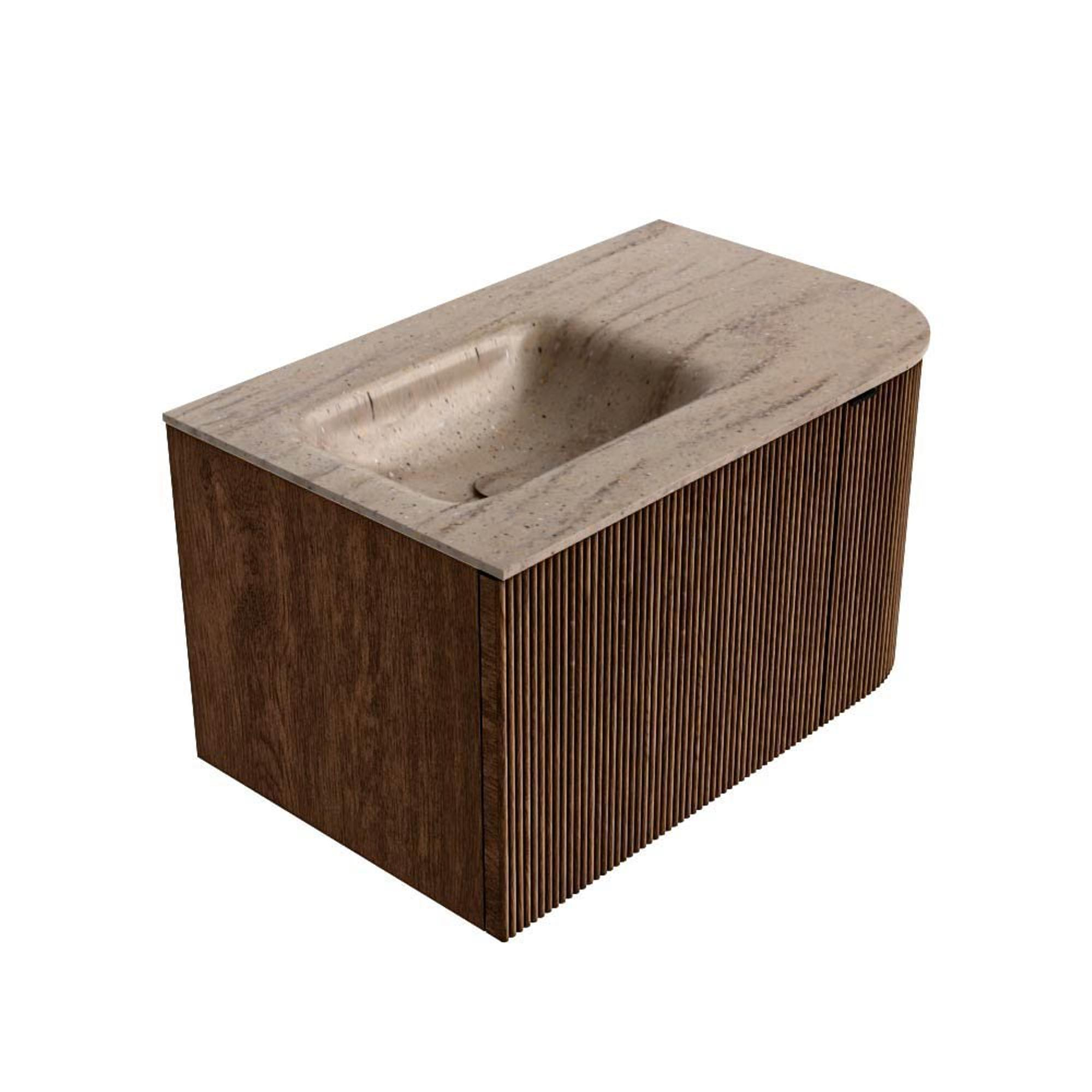MONDIAZ KURVE-DLUX Meuble de salle de bains 75cm arrondi Droite couleur Walnut avec 1 tiroir et 1 porte. Lavabo GRUNNE Gauche sans trou de robinet Saba.