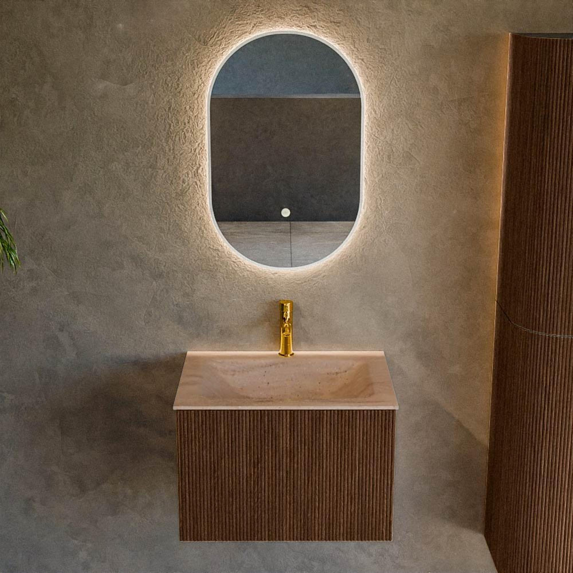 Vous recherchez un meuble de salle de bains compact et luxueux qui dégage chaleur et design, tout en restant pratique à utiliser au quotidien ? Alors cet ensemble de 60 cm de large est un choix judicieux aussi bien pour les petites que pour les salles de bains de taille moyenne, les toilettes ou les élégantes salles de bains pour invités. La couleur bois profonde apporte immédiatement de l'ambiance et se combine à merveille avec des éléments sanitaires blancs, des accents noirs ou de douces teintes naturelles. Grâce au montage mural, l’espace paraît plus calme et plus aéré, tout en offrant néanmoins un espace de rangement surprenant dans le tiroir. Le lavabo intégré avec trou de robinet au centre rend ce meuble idéal pour un mitigeur de lavabo simple et une utilisation quotidienne par toute la famille. Si vous recherchez un meuble de salle de bains qui réunit qualité, design et fonctionnalité dans une largeur compacte, alors cet ensemble s’intègre parfaitement dans vos projets.
