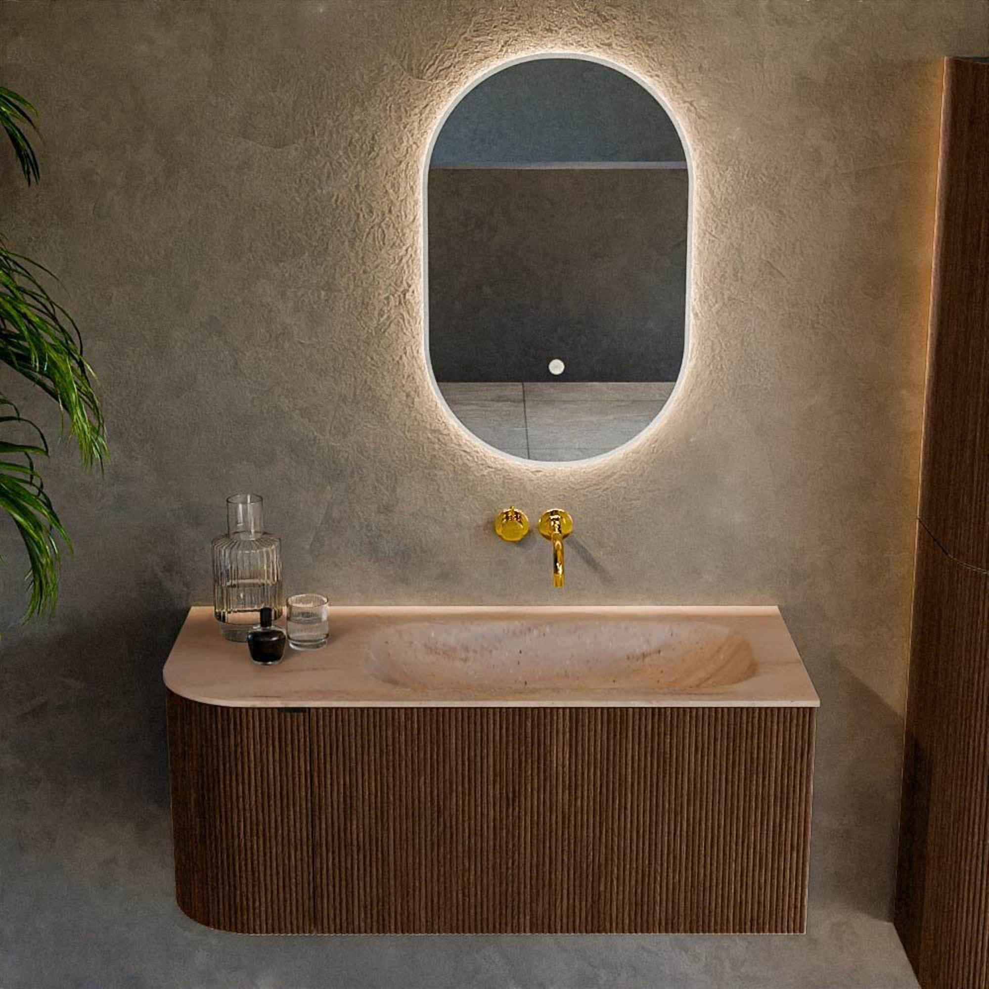 MONDIAZ KURVE-DLUX 105cm badmeubel ronding Links kleur Walnut met 1 lade en 1 deur. Wastafel BIG SMALL Rechts zonder kraangat Saba.