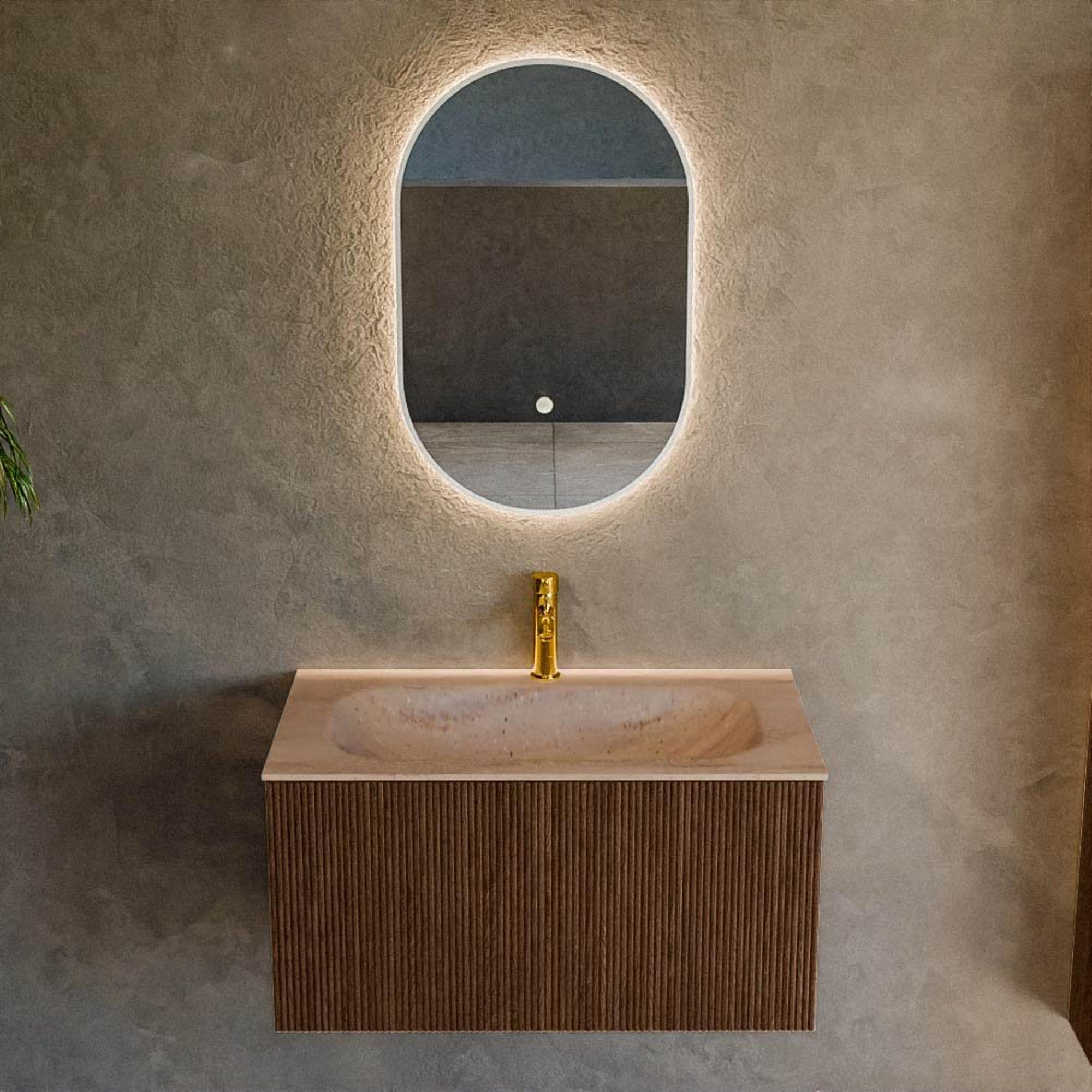 MONDIAZ KURVE-DLUX 80cm badmeubel kleur Walnut met 1 lade en 0 deuren. Wastafel BIG SMALL Midden 1 kraangat Saba.