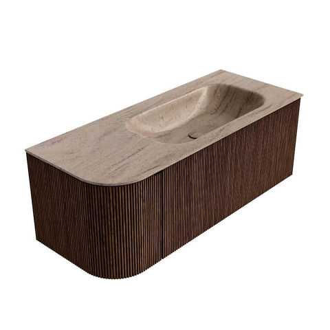 MONDIAZ KURVE-DLUX Meuble de salle de bains 115cm arrondi à gauche couleur Walnut avec 1 tiroir et 1 porte. Lavabo BIG SMALL à droite 1 trou de robinet Saba.