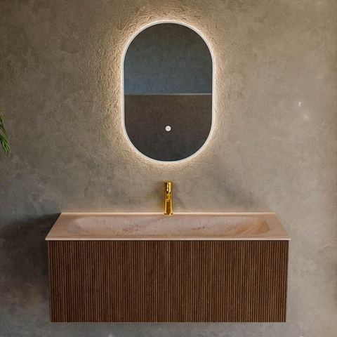 La couleur walnut combinée à la façade à nervures verticales donne immédiatement à votre salle de bains un aspect luxueux et contemporain. La teinte bois ajoute de la chaleur, tandis que les lignes épurées et la façade sans poignées assurent un look moderne. Le relief vertical casse la surface plane et fait paraître le meuble optiquement plus élancé, ce qui est particulièrement agréable dans une salle de bains plus petite ou étroite. En optant pour un meuble de salle de bains aspect bois, vous créez facilement une ambiance de spa, surtout en combinaison avec des carreaux sobres et des accessoires doux. Ce meuble devient ainsi le point central élégant de votre espace de toilette, sans être tape-à-l’œil.