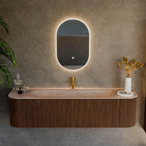 Si vous recherchez un meuble de salle de bains qui crée immédiatement une ambiance tout en restant épuré, cette combinaison est alors parfaitement adaptée. La largeur généreuse de 170 cm dans une teinte noyer offre une base chaleureuse et naturelle, tandis que les formes arrondies à gauche et à droite créent une allure douce et accueillante. La structure à nervures verticales sur la façade apporte davantage de profondeur et de caractère, faisant du meuble un véritable point de mire devant un mur de carrelage sobre. Comme l’ensemble est fixé en suspension au mur, le sol reste bien visible, ce qui donne à votre salle de bains une impression de grandeur et de légèreté. Cela rend le meuble particulièrement adapté aux salles de bains modernes et luxueuses dans lesquelles vous souhaitez faire une déclaration sans compromettre le calme et l’équilibre.