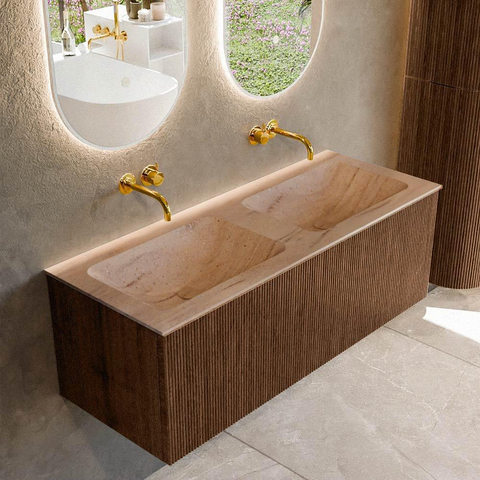 Avec ce meuble de salle de bains spacieux et mural, vous créez en une seule fois une composition de double lavabo à la fois élégante et pratique dans votre salle de bains. La chaude teinte bois et le design élégant s’intègrent parfaitement dans des salles de bains modernes, naturelles et de style hôtel chic, mais ce meuble trouve également parfaitement sa place dans une salle de bains familiale plus épurée. Grâce à la largeur généreuse de 120 cm et au double lavabo, c’est un choix malin si vous utilisez souvent la salle de bains à deux, par exemple avec votre partenaire ou avec la famille aux heures de pointe. Le tiroir sans poignée offre un espace de rangement structuré pour les produits de salle de bains du quotidien, tandis que le plan de vasque minimaliste sans trous de robinet vous laisse la liberté de choisir vous-même des robinets encastrés ou à poser assortis. Si vous recherchez une combinaison de design, de confort et d’agencement pratique, cet ensemble constitue une base très bien pensée pour la salle de bains de vos rêves.