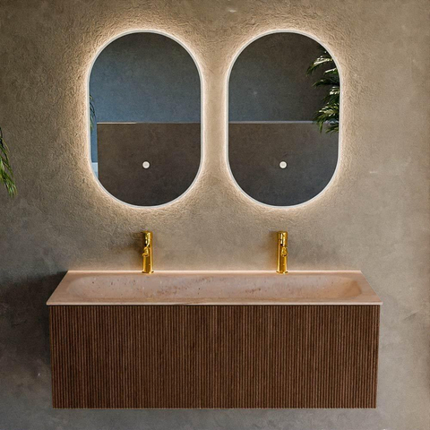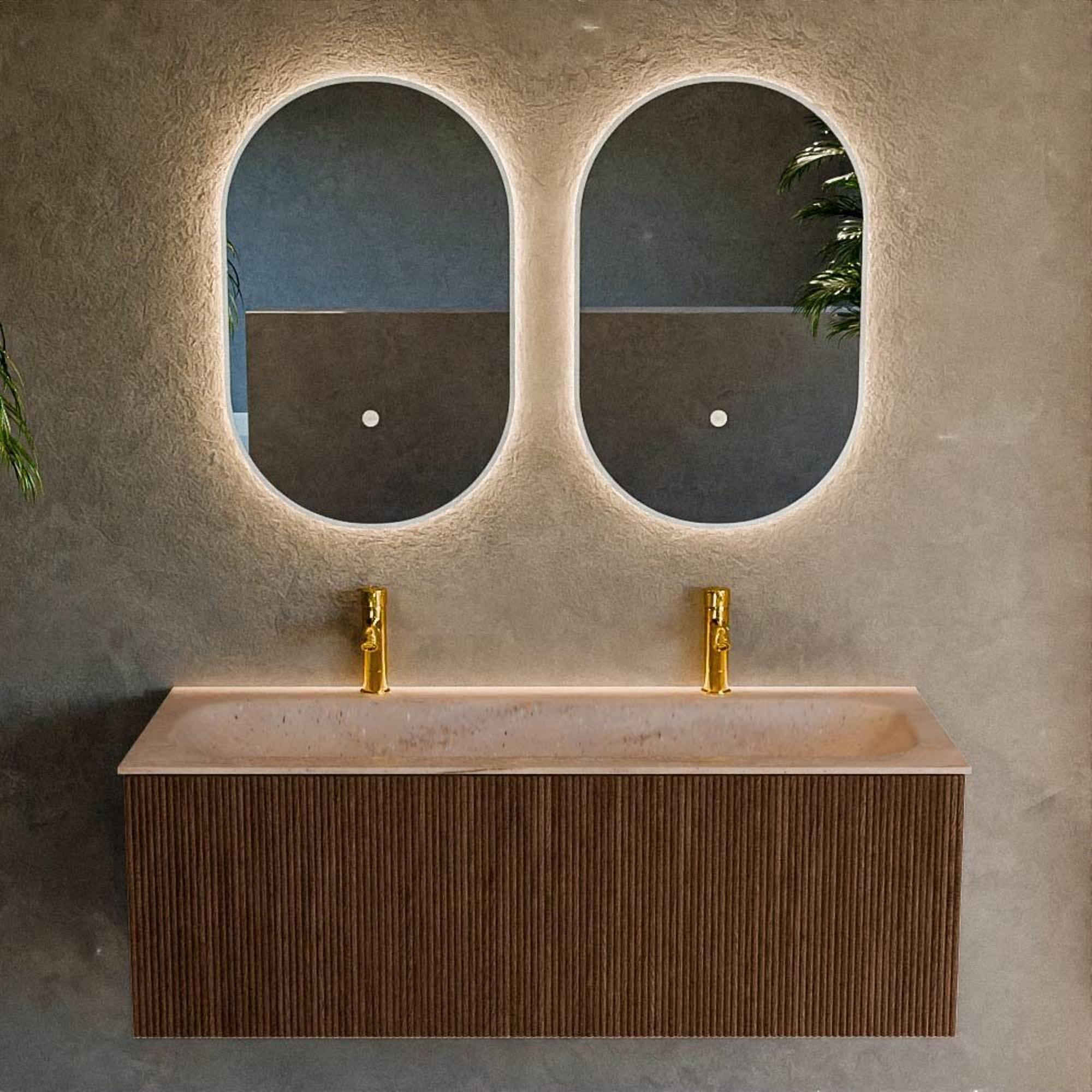 Avec ce meuble de salle de bains généreux, vous faites entrer chez vous un accroche-regard à la fois élégant et pratique, qui s’intègre parfaitement dans une salle de bains moderne ou de style hôtel chic. La chaude teinte noyer et la façade élégante avec structure nervurée verticale créent immédiatement une ambiance, tandis que la largeur généreuse de 120 cm est idéale si vous recherchez un peu plus d’espace de travail et de rangement, par exemple dans une salle de bains familiale ou une suite parentale luxueuse. Le lavabo intégré avec vasque centrale et deux trous de robinet rend en plus le meuble très adapté aux matinées chargées, lorsque vous souhaitez utiliser le lavabo à deux. Grâce au montage mural, l’ensemble paraît épuré et aéré, de sorte que ce meuble reste léger et ordonné même dans des salles de bains de taille moyenne.
