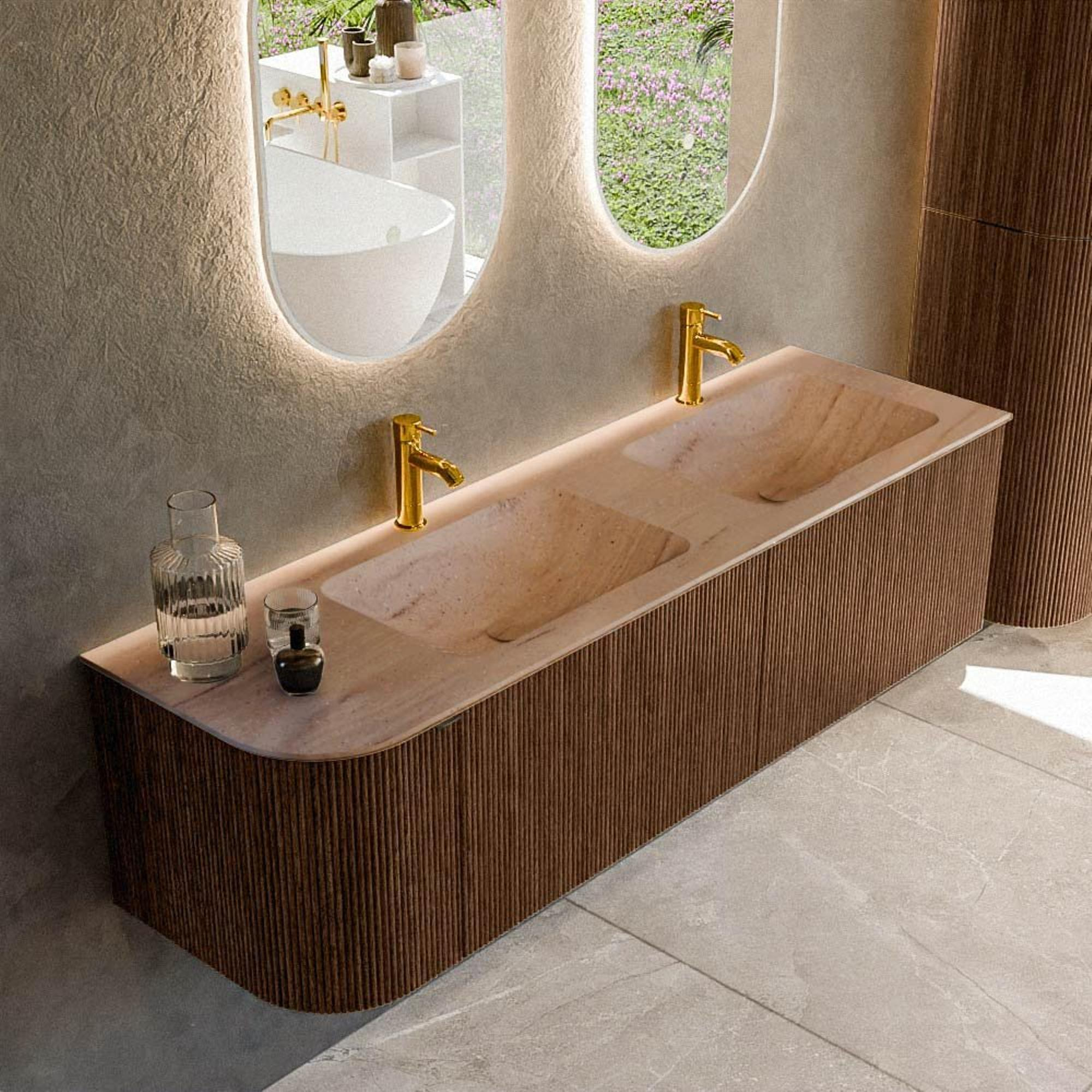 Ce meuble de salle de bains se distingue immédiatement par la combinaison de la forme arrondie à gauche et de la structure verticale à rainures sur la façade. Cet arrondi doux n'offre pas seulement un look élégant, mais aussi davantage de confort de passage le long du meuble, par exemple près d'un couloir ou dans une partie plus étroite de la salle de bains. La couleur walnut apporte chaleur et ambiance, rendant la pièce immédiatement accueillante. Les rainures verticales ajoutent un accent moderne et architectural que l'on retrouve habituellement dans les intérieurs haut de gamme. En combinaison avec la vasque LEAF beige en Saba, vous obtenez un aspect ton sur ton apaisant qui se marie parfaitement avec des matériaux naturels, des accents noirs ou au contraire des carreaux clairs. Vous créez ainsi facilement un ensemble harmonieux, que vous optiez pour une atmosphère de spa luxueux ou une salle de bains design minimaliste.