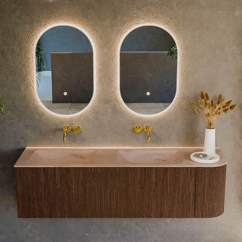 Ce meuble de salle de bains spacieux est un choix idéal si vous souhaitez combiner une apparence moderne et luxueuse avec un espace de rangement pratique. Avec sa grande largeur, il convient parfaitement aux salles de bains de taille moyenne à grande, par exemple comme élément phare dans une salle de bains design ou comme meuble familial confortable pouvant accueillir plusieurs utilisateurs en même temps. La couleur chaude du bois et le doux arrondi sur le côté droit créent un look chaleureux et organique, tandis que la double vasque intégrée en solid surface offre un aspect justement épuré et minimaliste. Grâce à l’agencement astucieux avec tiroirs et une porte, vous gardez vos accessoires de salle de bains quotidiens bien organisés et hors de vue, de sorte que votre plan de lavabo reste calme et ordonné. Ce meuble s’intègre particulièrement bien dans les intérieurs contemporains avec des matériaux naturels, mais se marie aussi très bien avec des robinets et accessoires noirs ou au contraire clairs.