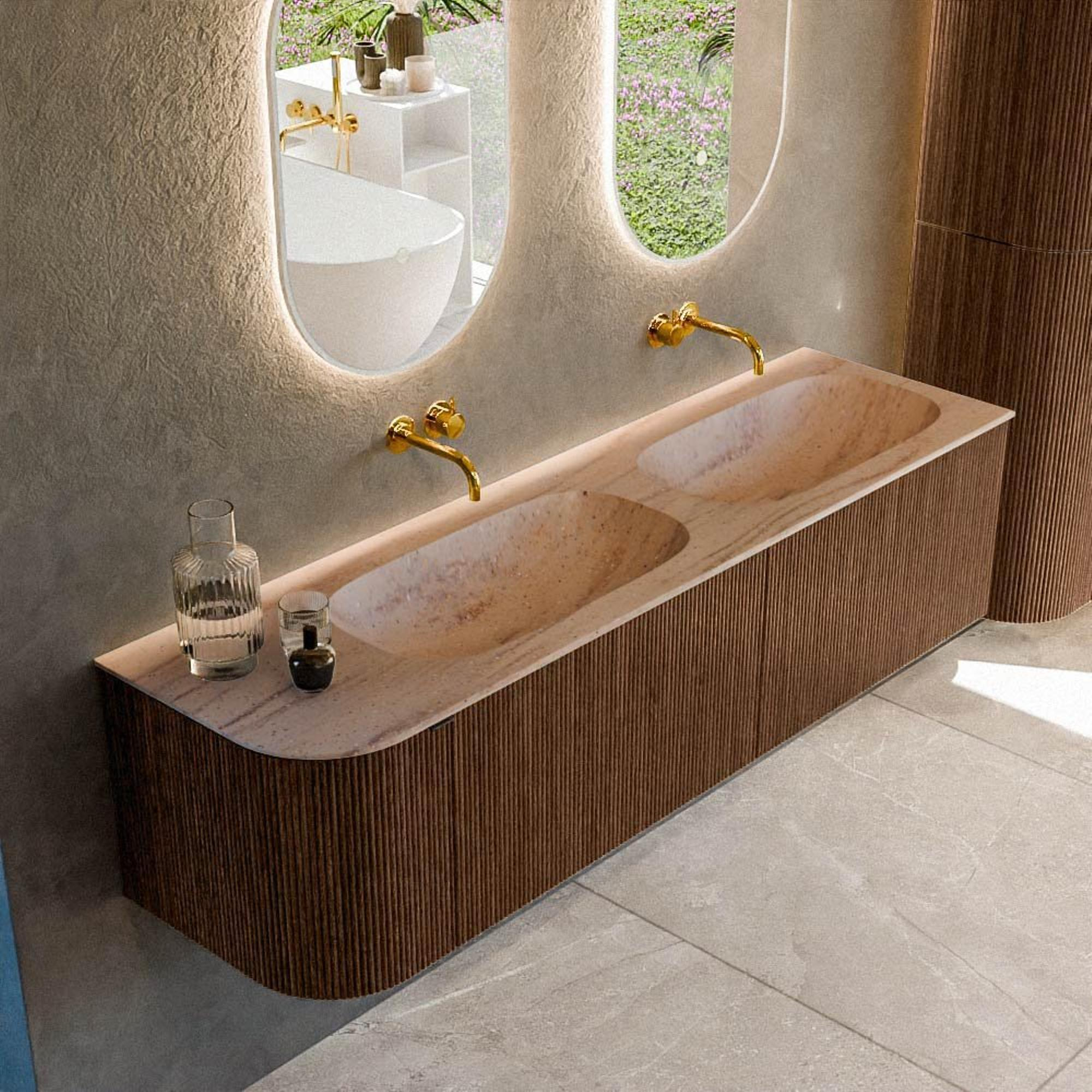 Avec ce meuble de salle de bains spacieux, vous créez en une seule fois une base luxueuse et pratique pour votre salle de bains. Sa grande largeur offre un espace confortable pour deux personnes simultanément, tandis que l’arrondi organique sur le côté gauche optimise l’espace de circulation dans votre salle de bains. Grâce à sa teinte bois chaude, le meuble s’intègre parfaitement aussi bien dans les salles de bains design modernes que dans les intérieurs chaleureux et naturels. Le double lavabo sans trou de robinet est idéal si vous préférez travailler avec des robinets posés sur le plan ou avec un robinet mural. Vous composez ainsi vous-même la combinaison parfaite, adaptée à vos souhaits, à la situation de votre famille et à vos routines quotidiennes.