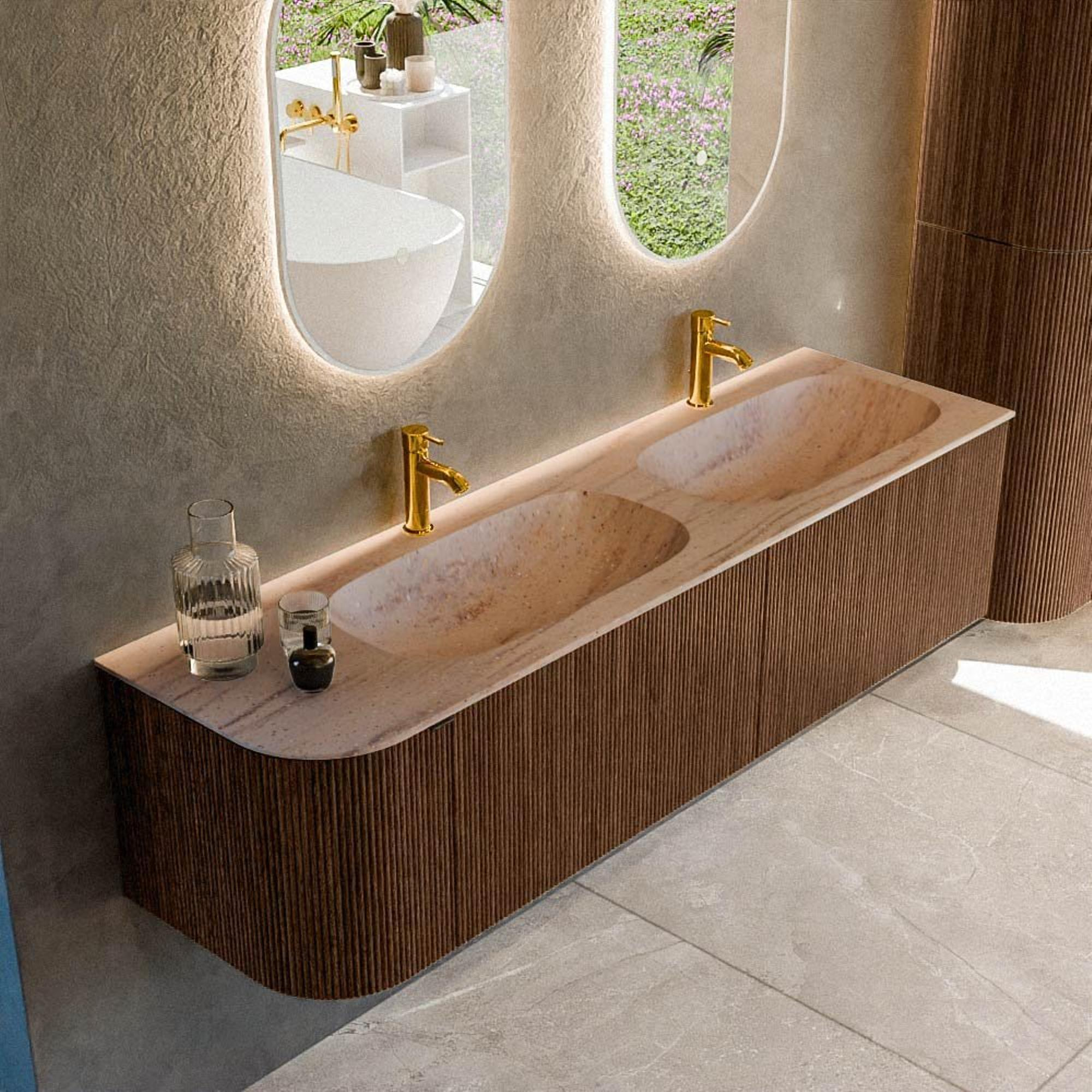 Avec ce meuble de salle de bains spacieux, vous créez en une seule fois une base calme et luxueuse pour votre salle de bains. La largeur généreuse de 165 cm offre amplement d’espace pour deux personnes en même temps, ce qui le rend idéal pour une salle de bains familiale très utilisée ou une suite parentale confortable. La couleur bois chaude et le côté gauche arrondi assurent une apparence douce et organique qui s’intègre parfaitement dans des intérieurs modernes, d’inspiration hôtelière chic ou scandinave. La double vasque avec deux trous de robinet sur le côté droit rend les routines quotidiennes comme le brossage des dents et le maquillage claires et détendues. Grâce à l’agencement pratique avec tiroirs et porte, vous pouvez ranger les produits de soin discrètement hors de vue, tandis que les façades minimalistes et le design suspendu agrandissent visuellement l’espace et le rendent plus apaisant. Si vous optez pour un ensemble épuré et ordonné avec beaucoup d’espace de rangement et une apparence luxueuse, ce meuble est un choix particulièrement judicieux.