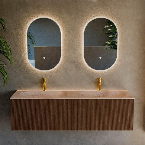 La couleur noyer avec façades à nervures verticales donne immédiatement à votre salle de bains une apparence chaleureuse et naturelle et s’accorde parfaitement avec des styles d’intérieur populaires tels que moderne, hôtel chic et Japandi. Le décor bois a un aspect chaleureux et luxueux, tandis que les lignes épurées et le look sans poignées gardent le meuble calme et minimaliste. Grâce à la largeur de 150 cm, la façade s’impose vraiment comme un élément phare sous votre miroir ou armoire de toilette. Combinez la teinte bois avec des robinets et accessoires noirs, chromés ou en laiton brossé pour une touche personnelle. Vous créez ainsi facilement un ensemble cohérent dans lequel ce meuble joue sans effort le rôle principal.