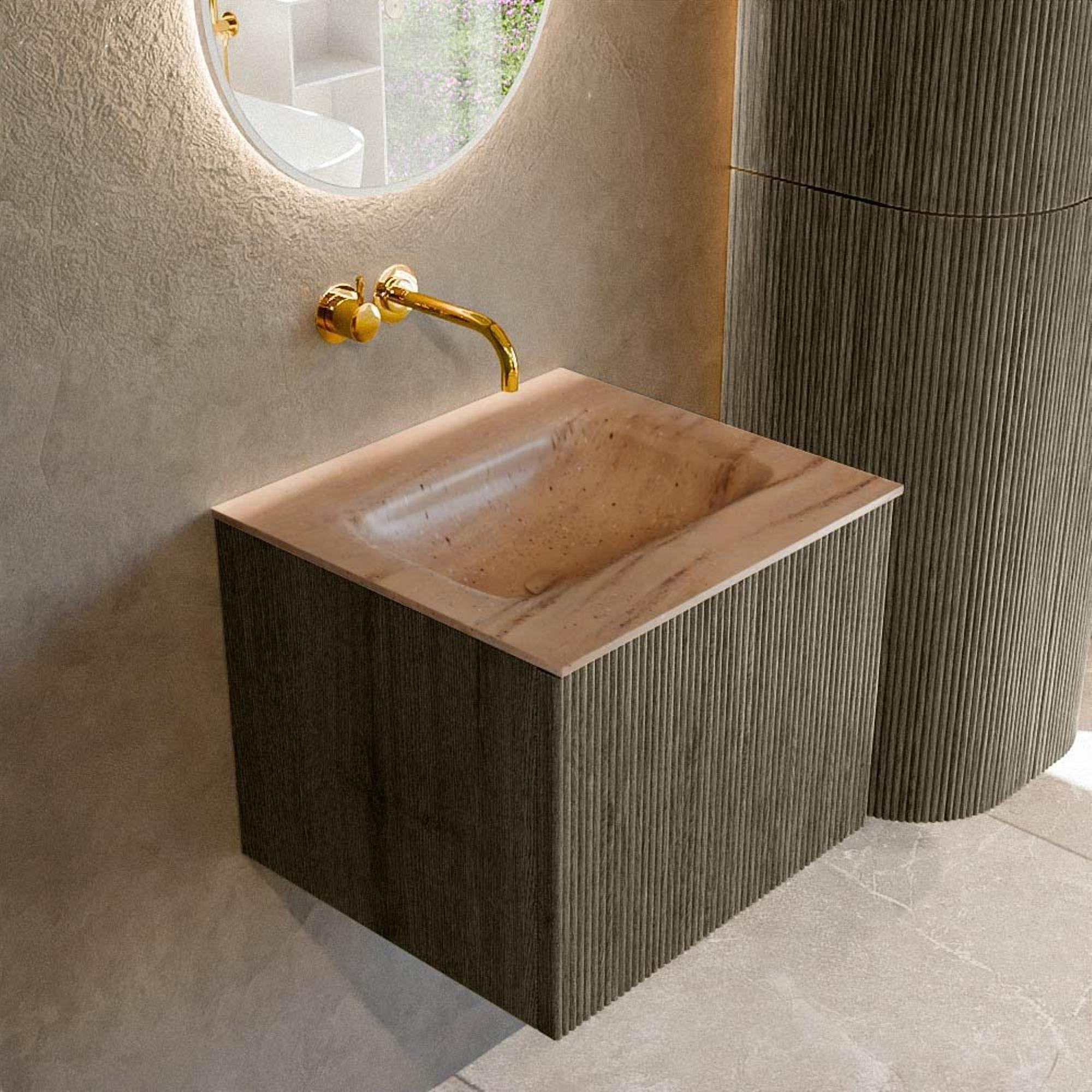 Le meuble se distingue immédiatement par sa façade rainurée verticale et sa belle couleur Shadow. Cette teinte grise profonde paraît chaleureuse et luxueuse et se marie à merveille avec des robinets noirs, du métal brossé ou au contraire des murs et carrelages blancs. Le motif à rainures apporte une profondeur et une texture supplémentaires à votre salle de bains, faisant de votre meuble un véritable objet de design plutôt qu’une simple solution pratique. Grâce aux formes arrondies de la série, l’ensemble s’intègre harmonieusement dans les salles de bains organiques modernes. Si vous optez pour plusieurs éléments de la même couleur, vous créez du calme et de l’unité dans la pièce.