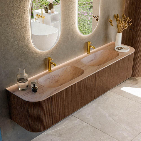 Si vous êtes à la recherche d'un meuble de salle de bains spacieux qui soit à la fois pratique et un véritable créateur d'ambiance dans votre salle de bains, alors cette combinaison est un choix particulièrement judicieux. Avec sa grande largeur, ce meuble offre tout l'espace nécessaire pour les matinées chargées avec plusieurs membres de la famille, mais aussi pour ceux qui aiment simplement disposer de beaucoup de surface de dépose et d'espace de rangement. La teinte chaude du bois s'intègre à merveille dans les salles de bains modernes, d'inspiration hôtel chic et scandinave, tandis que les formes arrondies apportent une apparence douce et accueillante. La double vasque rend ce meuble idéal pour les familles nombreuses, les couples ou toute personne souhaitant disposer de sa propre place fixe devant la vasque. Grâce au montage mural, l'ensemble dégage une impression de légèreté et d'espace, même dans les salles de bains de taille moyenne. Si vous recherchez une combinaison de design, de confort et d'agencement astucieux, ce meuble répond parfaitement à vos attentes.