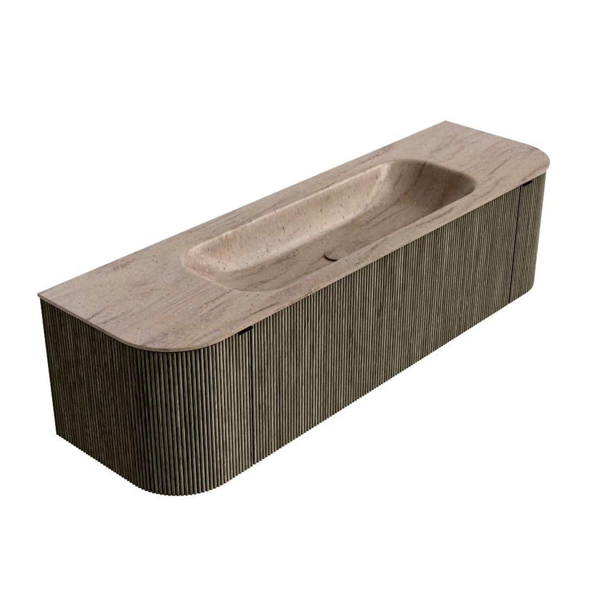 Les formes arrondies caractéristiques, tant sur le côté gauche que sur le côté droit, créent une silhouette élégante qui s’intègre harmonieusement dans l’espace, même dans les salles de bains plus petites où les meubles droits paraissent parfois massifs. La couleur Shadow est une teinte de gris profonde et chaleureuse qui se marie à merveille avec des carreaux clairs comme avec des accents foncés, ce qui vous permet de créer facilement une atmosphère de spa luxueuse. La structure nervurée verticale des façades renforce le design et apporte davantage de profondeur et de caractère. Comme les lignes se prolongent de manière fluide sur toute la largeur de 160 cm, le meuble donne l’impression d’une pièce sur mesure, conférant immédiatement à la salle de bains une apparence haut de gamme.