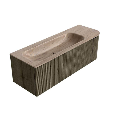L’angle arrondi à droite donne à ce meuble de salle de bains une forme particulièrement fluide, ce qui adoucit immédiatement l’aspect de votre salle de bains et rend le passage le long du meuble plus agréable et plus sûr. La couleur Shadow combinée à la façade cannelée verticale crée une ambiance luxueuse, presque hôtelière, tandis que les lignes horizontales du tiroir donnent au meuble une impression de largeur supplémentaire et de sérénité. Comme le meuble est suspendu au mur, le sol reste dégagé et l’espace paraît plus grand et plus aéré – idéal aussi bien dans les petites que dans les grandes salles de bains. Le design donne son meilleur effet avec un miroir ou une armoire de toilette assorti de la même largeur, afin de créer un ensemble harmonieux.