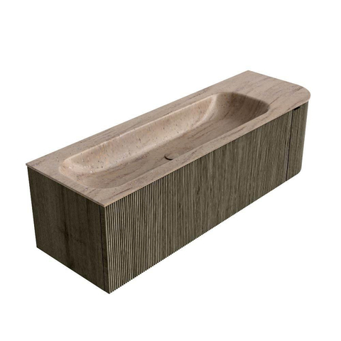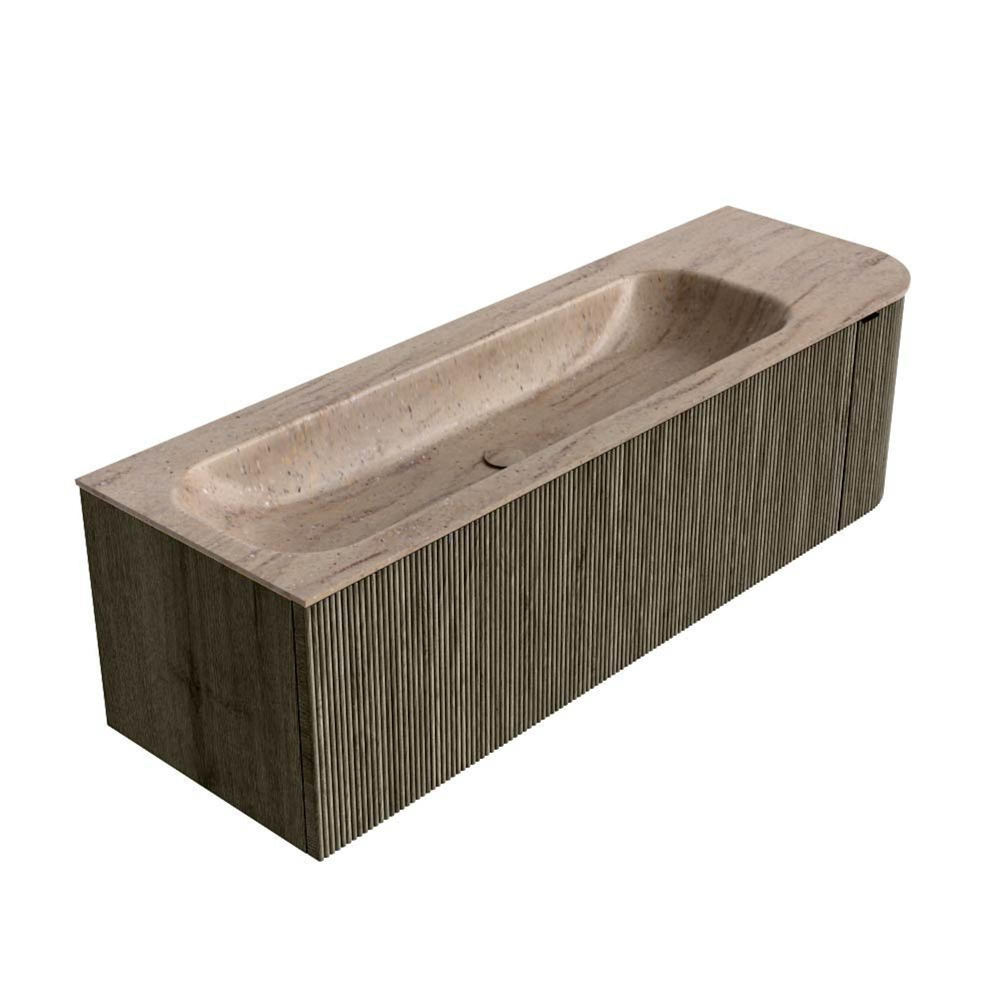 Le côté droit arrondi confère au meuble une forme douce et organique qui donne immédiatement à votre salle de bains un caractère moderne et raffiné. Comme l’arrondi est orienté vers l’espace de circulation, vous évitez les chocs contre des angles vifs, ce qui est particulièrement appréciable en famille ou dans une salle de bains compacte. Visuellement, le meuble paraît plus élancé qu’un modèle rectangulaire standard de 145 cm, tout en offrant le même espace de rangement généreux. La couleur Shadow et la façade à nervures verticales créent ensemble une apparence luxueuse et architecturale qui s’intègre parfaitement dans un style de salle de bains moderne, hôtel chic ou japandi.