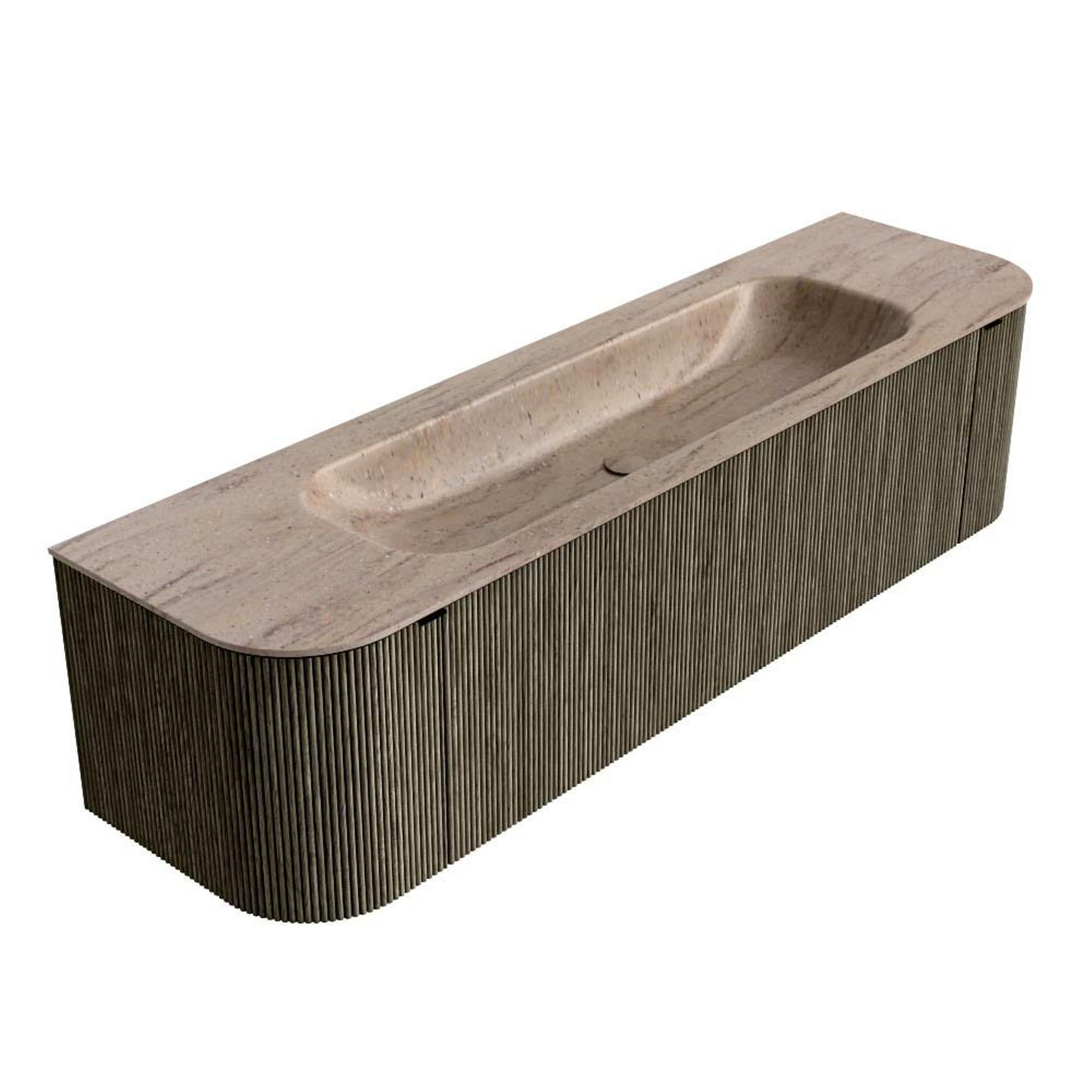 Les angles arrondis à gauche et à droite donnent au meuble une forme plus douce et organique qui attire immédiatement le regard, sans être criarde. La couleur Shadow est une teinte de gris profonde qui allie chaleur et modernité ; parfaite en combinaison avec des accents noirs, de la robinetterie blanc mat ou des carreaux aspect bois et béton. La structure de rainures verticales sur la façade crée de la profondeur et un aspect d’hôtel luxueux, tandis que le système sans poignées push-to-open préserve les lignes épurées. Vous obtenez ainsi un meuble qui non seulement a un look élégant, mais qui apporte aussi du calme dans la pièce et se combine facilement avec différents styles de salle de bains, du chic moderne à l’industriel contemporain.