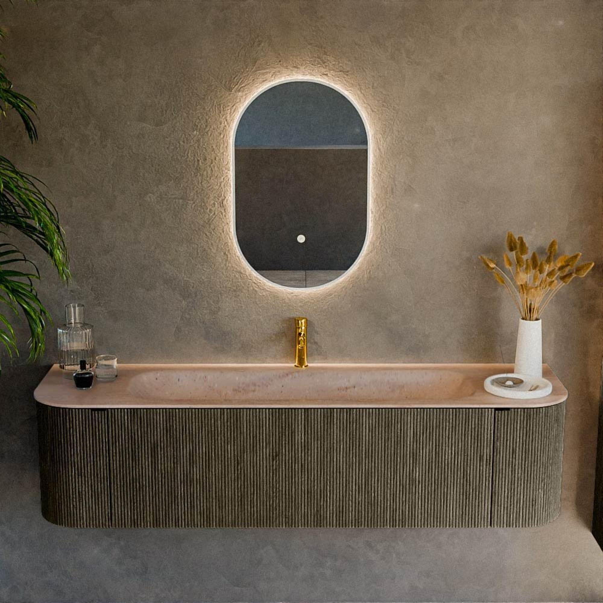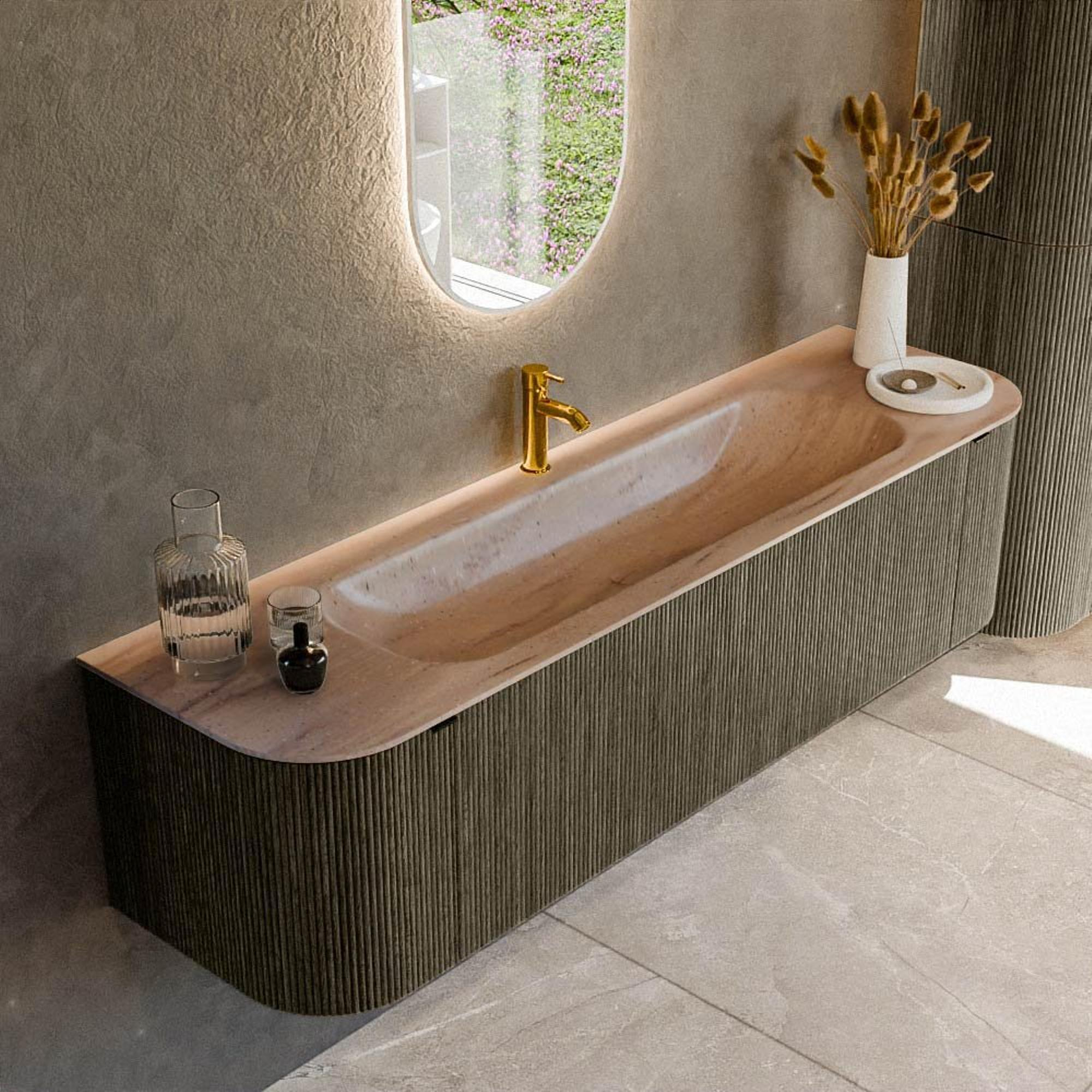 Les formes arrondies à gauche et à droite confèrent au meuble un aspect unique, presque organique. Pas d’angles vifs le long desquels vous passez, mais des lignes fluides qui inspirent confiance et sérénité. La couleur Shadow assure un look moderne et luxueux qui se marie à merveille avec des robinets et accessoires noirs, chromés ou en métal brossé. La structure verticale rainurée en façade ajoute une profondeur et une texture supplémentaires, faisant ressortir encore davantage le meuble en tant que point central de la salle de bains. Grâce à sa largeur de 170 cm, l’ensemble paraît en outre spacieux et haut de gamme, idéal si vous aimez faire une véritable déclaration de design sans sacrifier la fonctionnalité.