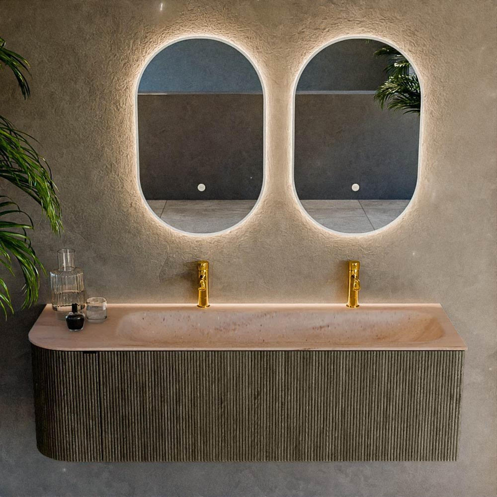 La teinte de gris profond Shadow combinée avec le lavabo en Solid Surface couleur Saba apporte une apparence calme et moderne qui s’accorde bien aussi bien avec des carreaux effet béton qu’avec des tons bois chaleureux. La forme rectangulaire aux angles arrondis et la douce courbe à gauche créent un design accueillant, presque digne d’un hôtel, qui donne immédiatement un coup de jeune à votre salle de bains. La structure nervurée verticale de la façade (façade 3D) ajoute de la finesse et de la profondeur, faisant de ce meuble un véritable point de mire même sans poignées voyantes. Le lavabo BIG LARGE sur le côté droit offre suffisamment de place pour se laver les mains, poser vos produits de soin quotidiens ou présenter un joli ensemble de savon. Avec deux trous de robinet, vous pouvez opter pour une configuration à double robinet, idéale pour les matins chargés, ou par exemple pour un robinet et un distributeur de savon intégré. Vous adaptez ainsi précisément l’apparence et l’usage au style de votre salle de bains.
