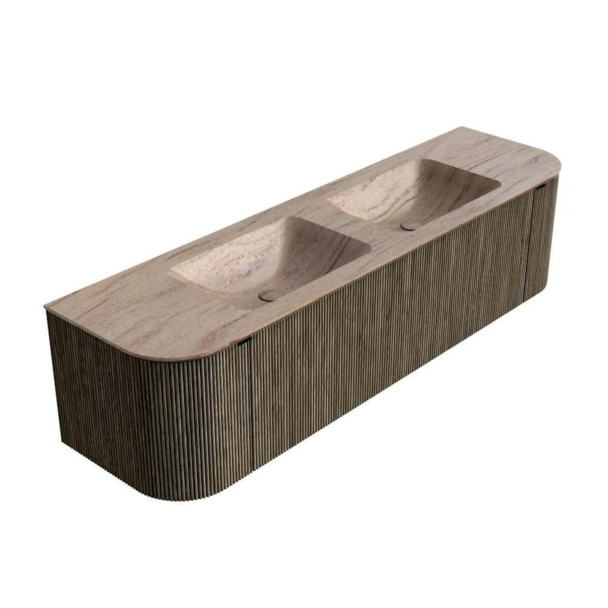 MONDIAZ KURVE-DLUX Meuble de salle de bains 170cm arrondi Gauche + Droite couleur Shadow avec 1 tiroir et 2 portes. Vasque LEAF Double sans trou de robinet Saba.