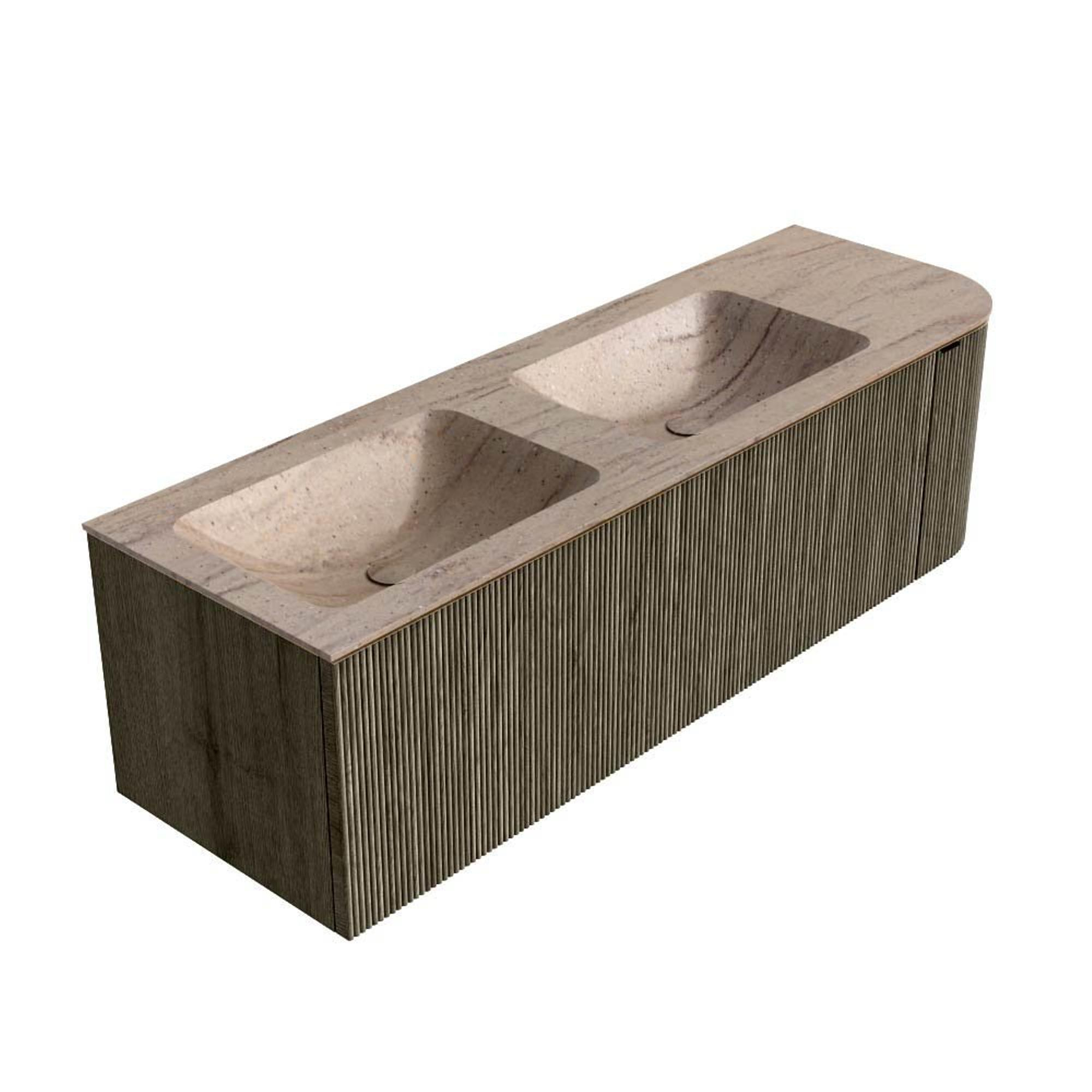 MONDIAZ KURVE-DLUX meuble de salle de bains 145cm arrondi à droite couleur Shadow avec 1 tiroir et 1 porte. Lavabo LEAF double / gauche 2 trous de robinet Saba.