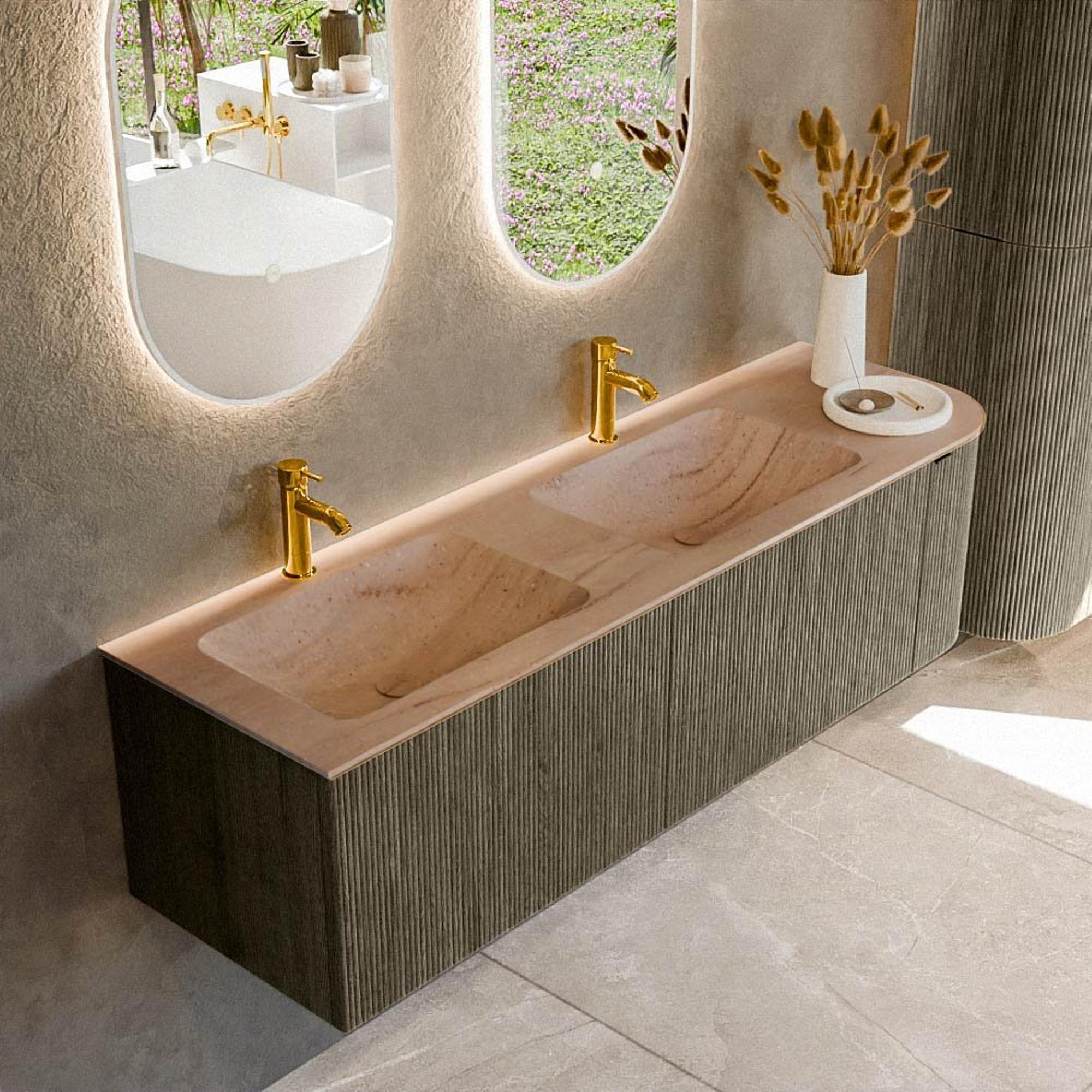 MONDIAZ KURVE-DLUX 155cm meuble de salle de bains arrondi Droite couleur Shadow avec 2 tiroirs et 1 porte. Lavabo LEAF Double / Gauche 2 trous de robinet Saba.