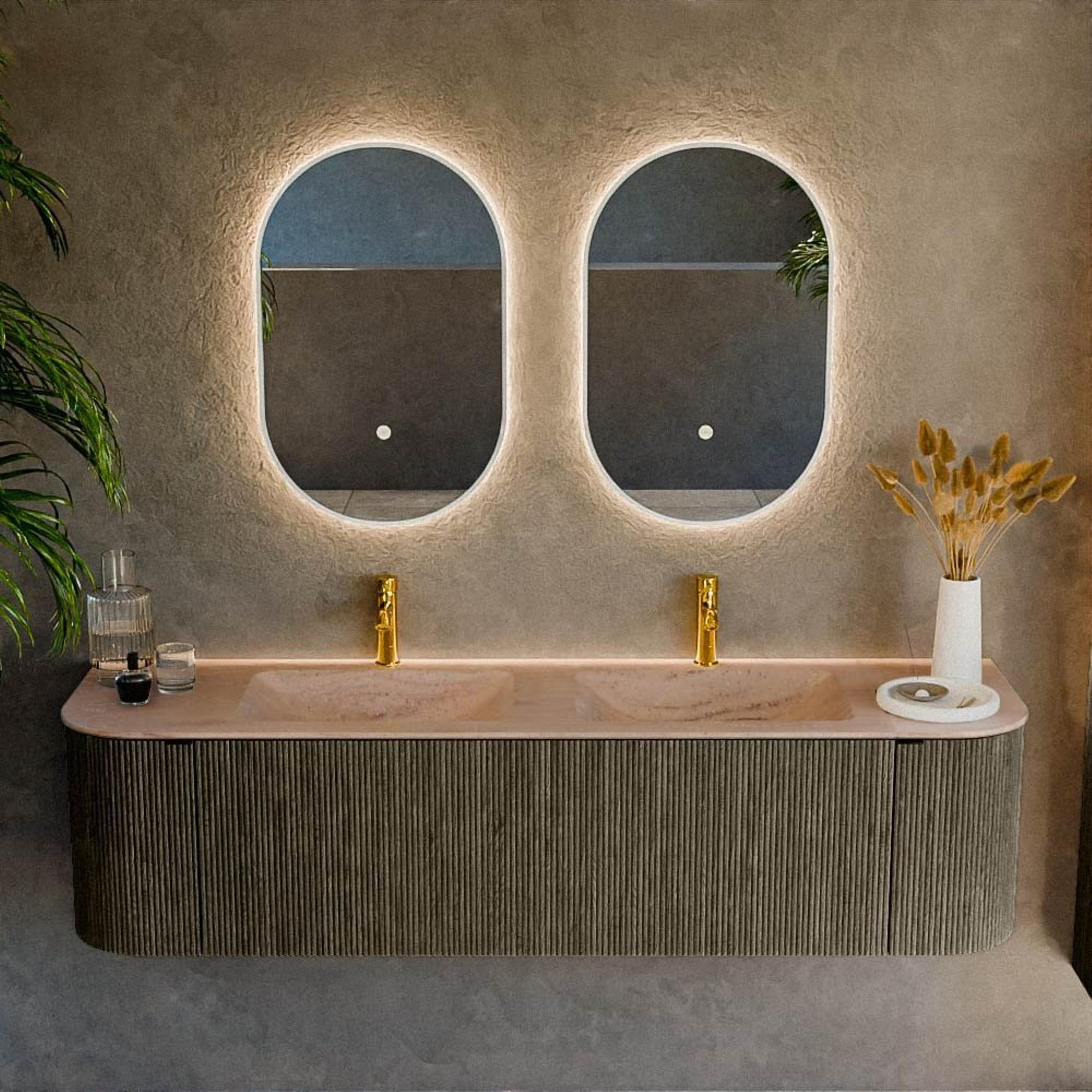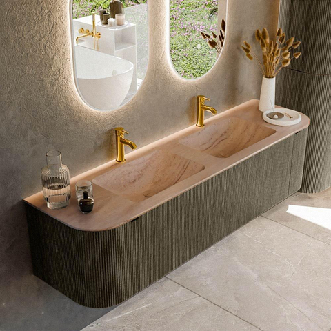 Avec ce meuble de salle de bains spacieux, vous créez en une seule fois une base luxueuse et apaisante pour votre salle de bains. Grâce à sa grande largeur, il est idéal pour une famille, pour les matins chargés à deux devant le miroir ou tout simplement si vous aimez disposer de beaucoup d’espace de rangement et de surface de dépose. Les lignes épurées sont joliment adoucies par les angles arrondis, ce qui donne à l’ensemble un aspect chaleureux tout en restant moderne. La double vasque rend le brossage des dents à deux ou votre routine du matin beaucoup plus détendue, tandis que la combinaison de portes et de tiroir offre un espace de rangement structuré. Ce meuble se sent à l’aise dans une salle de bains design, mais s’intègre tout aussi bien dans un style scandinave épuré ou hôtel-chic. Si vous recherchez un meuble sans poignées, élégant, non seulement beau mais aussi réellement fonctionnel pour votre salle de bains, alors cette combinaison est un choix particulièrement judicieux.